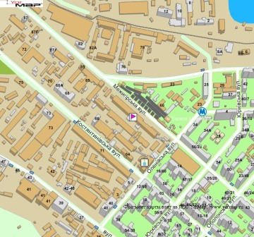 В доме с голубым флажком - сам Киевмлын, а в здании со значком голубого купола(ул.Оленевская) - кажется магазин.