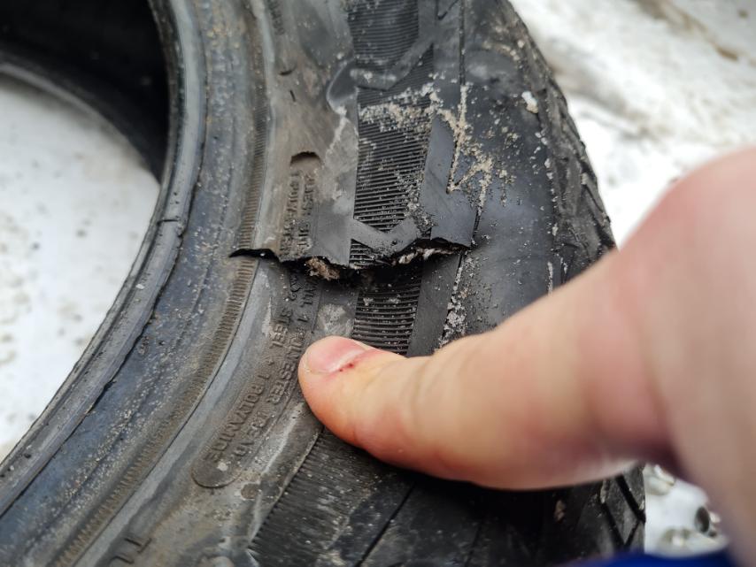 Їду, собі сьогодні, нікого не чіпаю... чую щось "шарк-шарк-шарк-шарк" Зупиняюсь, вихожу, - спущене переднє колесо. Холодно, мокро, сиро. Дістаю компресор, думаю може зможу підкачати і на шиномонтах доїхати. А фігушки, - не качається. Дивлюсь, а на бочині проріз на два пальці Ну ладно, доведеться таки запаску діставати і копирсатись у тій сніжній каші... повертаюсь, а там @#$ять ще й заднє в нуль
