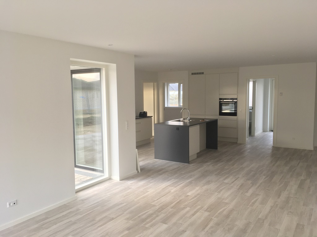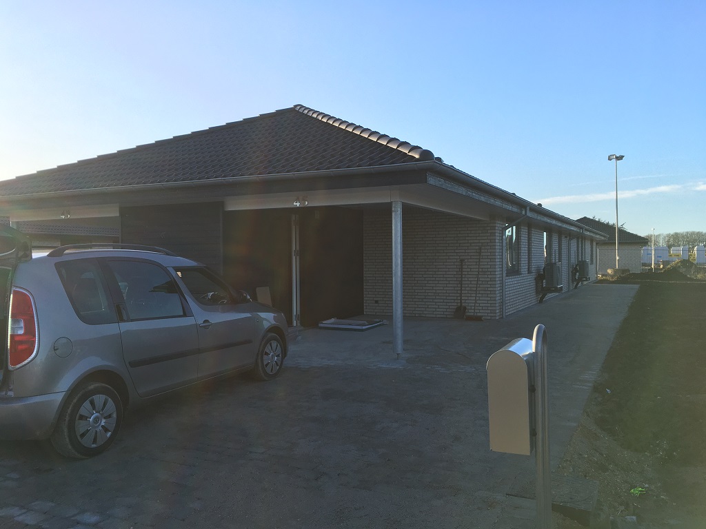 Проект: половина будинку (т.з. «допельхус»), один поверх, 125м2, три окремих спальні (дитячі – в одному крилі, батьківська – в іншому), два санузли (душ із туалетом), пральна кімната, на вулиці – сарайчик та крите паркомісце. Стіни: газобетон-мінвата-цегла, дах двоскатний з холодним горищем.Під нашою половиною – 5 соток землі, що також переходить у власність із половиною будинку (вартість базового оздоблення ділянки – газон, кущі по периметру – входить в загальну суму). Будинок здається «під ключ’, з готовим ремонтом, в вартості будинку закладено дві окремі суми – на кухонні меблі та на електрику – які треба використати тільки з підрядниками забудовника (хочешь дорожчу кухню – без проблем, із загальної вартості вирахують заздалегіть встановлену суму, решту – доплачуєш забудовнику). Особлива увага «мокрим місцям», тобто всі крани мають бути «закінчені» в мийках-меблях тощо. Що робив забудовник: ДУЖЕ довго (декілька місяців) велись грандіозні роботи з планування в полі: повністю знімався шар родючого грунту, щось там рівнялось-планувалось, переносились якісь титанічні обсяги землі туди-сюди, посередині поля викопали копанку, куди завели дренажі дощової води (там буде пруд). З рештою, розмітили дороги та закопали комунікації (вода, опалення, електрика, оптоволокно), поставили тимчасові розподільчі щити. Після цього закатали дороги в асфальт. Потім – почали власне будівництво. Стандартні проекти будували відразу чергою, тобто фундаменти одночасно по всьому полю – стіни одночасно – і т.п. Надовго застрягли з опаленням: комуна то погоджувала, то відмовляла з ЦО – зрештою, не погодили і забудовник змушений був перейти на теплові насоси (що непогано з огляду на їх ефективність та на те, що за споживання більше 4000кВтг на рік можна решту віднести на податкову пільгу). Десь на етапі зведення стін нас запросили до офісу забудовника для вибору дизайну в середині та матеріалів – ремонт під ключ враховано в вартості будинку і можна навіть дещо вибрати із стандартних, врахованих матеріалів (доплачували ми відносно небагато, брали внутрішні двері більш високого класу, трохи дорожчу за базову плитку тощо). Після цього – зустріч з дизайнером меблевої компанії (кухню замовити обов’язково) та з дизайнером електроінсталяторів – вся внутрішня розводка індивідуальна, у вартості враховано самий мінімально необхідний варіант – тут вже доплачувати довелось багато, всього під 150000 крон.