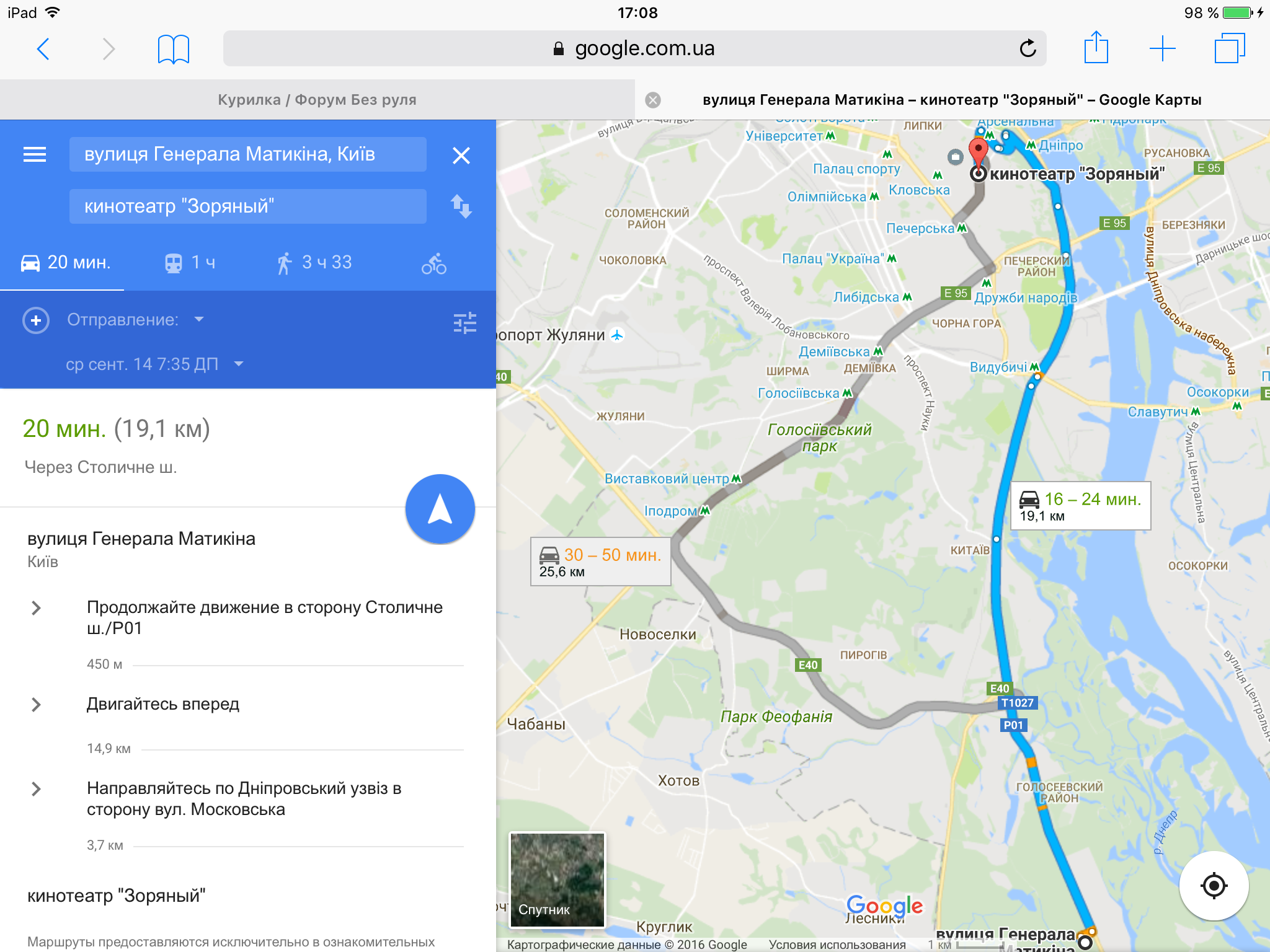 от базы Динамо до Салюта 17 км, если ехать сразу с аллеи на Салют, а если через стадион Динамо то и подавно больше. Это уже 15 минут. А оттуда до Зоряного и куда там еще. Ну в общем никак в 14 минут ваши не вложится.