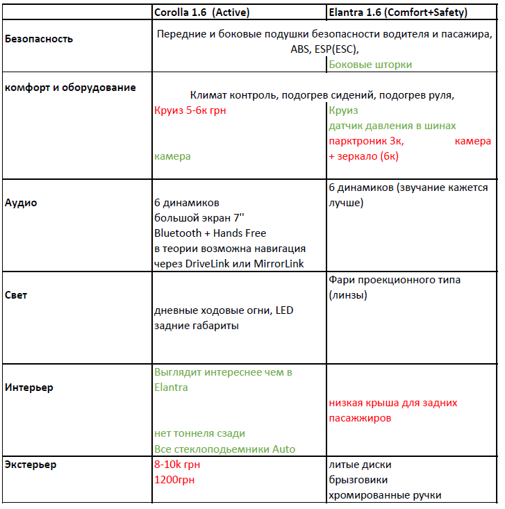 Elantra 1.6 Comfort+Safety В ближайшее время планирую пойти на тест драйв, до этого был в салоне. Машина появилась недавно потому плохих отзывов скорее всего еще не успели написать:) Интерьер Elantra может и выглядит по хуже чем Корола, но он тоже очень практичный. Мне кажется Elantra имеет следующие преимущества (прикреплю сравнение машин файлом): - Автоматическая коробка передач должна быть более надежной чем вариатор - Безопасность: боковые шторки, пройденный тест на столкновение с 25% перекрытием - круиз - Говорят, аудио по звучанию лучше чем в короле - литые диски