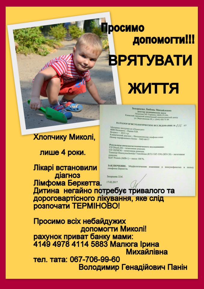 Добрый день! У нашей воспитательницы в детском саду у сына Коленьки (4 года) обнаружили Лимфому Беркетта 2 стадия (Лимфома Беркитта — это одна из неходжкинских лимфом, агрессивных и опасных. Свое развитие получает из В-лимфоцитов, имеет склонность прорастать и распространяться за пределами лимфатической системы, вовлекать в онкопроцесс спинномозговую жидкость, кровь и костный мозг. Чаще развивается лимфома Беркитта у детей при наличии в организме вируса Эпштейна-Барр. Быстрое развитие без должного лечения может закончиться летальным исходом, поскольку вирус вызывает инфекционный мононуклеоз.) С сегодняшнего дня ему назначили курс химиотерапии. Один день обходится в 2700 грн. Затем восстановительная терапия на пол года (стоимость в день 510 грн). Для семьи это не подъемная сумма. Мы со стороны родителей садика помогаем по мере возможности, но этого мало. Прошу всех неравнодушных откликнуться и помочь! Даже 100 человек по 30 грн - это один день химиотерапии и шанс жить!