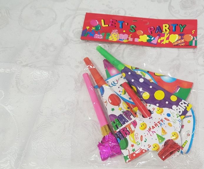 Отдам за яблоки наборы ко дню рождения, 10 наборов. В один набор входит: колпак с резинкой, маска с резинкой, две дудки с звуковым сигналом и две дудки с звуковым сигналом разворачивающие.