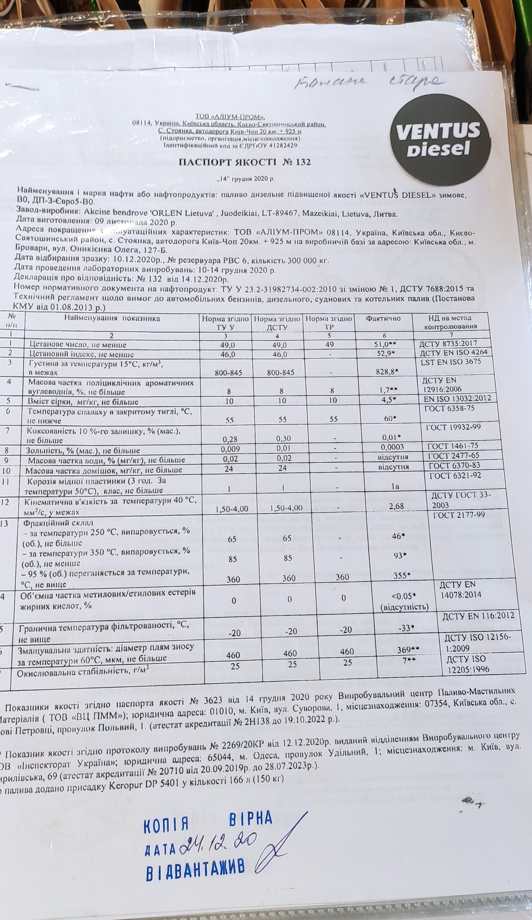 Чергова заправка на КЛО Ventus Diesel. Вже не Крячкі! А Бровари! ТОВ Аліум-Пром - дочка мержі КЛО. Змащувальна здатність - 369 не ідеально, але теж норм! В паливо вже додано присадку Keropur® DP 5401 Так шо необхідності додавати усіляки антигелі та інтрони нема, від слова зовсім!