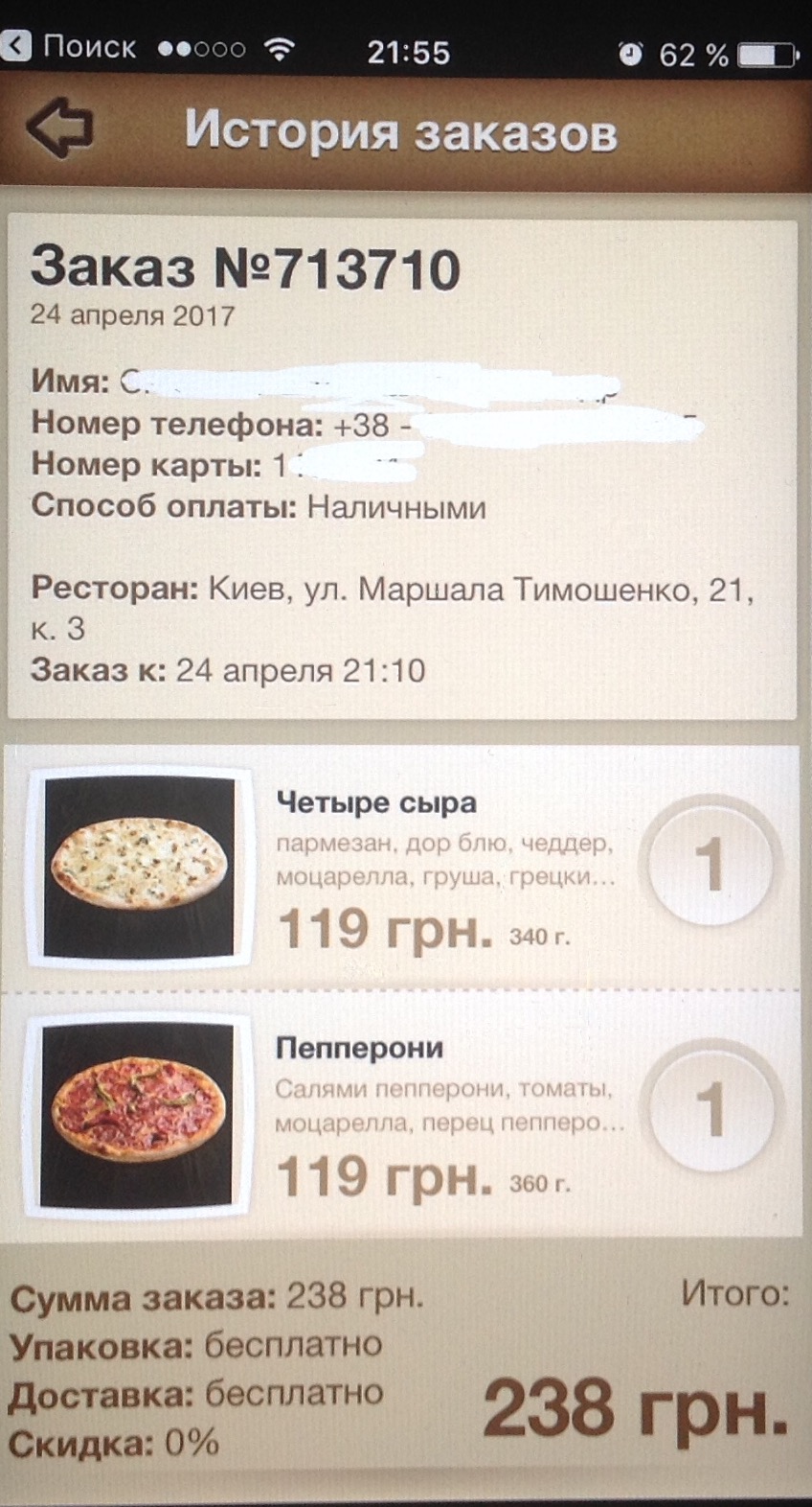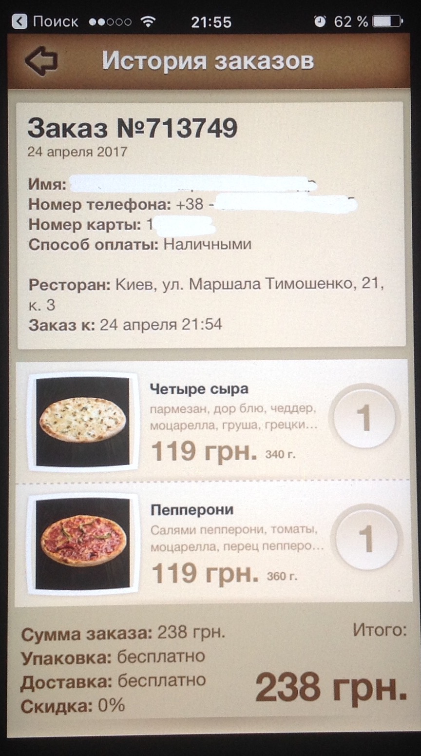 недоресторан mafia. 24.04.17 около 20:30 через мобильное приложение был сделан заказ на 2 пиццы самовывозом, по приезду в "ресторан" г.Киев, ул. М.Тимошенко, 21, к.3. Минут 10 они искали заказ, в последствии их сотрудником было сказано: "Заказа нет, заказывайте ещё раз!" Пиццайоло напротив стоит, говорит сделаю ваш заказ за 20 минут. Заказываю ещё раз и через 20 мин. перезванивает какая-то женщина и говорит, что "ресторан" пиццу вам на вынос не приготовит или заказывайте у них доставку или заказывайте ещё раз, ждите и езжайте забирать в другом ресторане. Занавес. Вот это уровень, обалдеть. Скрины заказов и аудиозаписи разговоров сохранил на память. Ранее постоянно у них приобретал продукцию, сейчас - голосую монетой, нет сервиса - нет клиента. Отговорил от этих "ресторанов" быстрого питания всех знакомых и друзей!