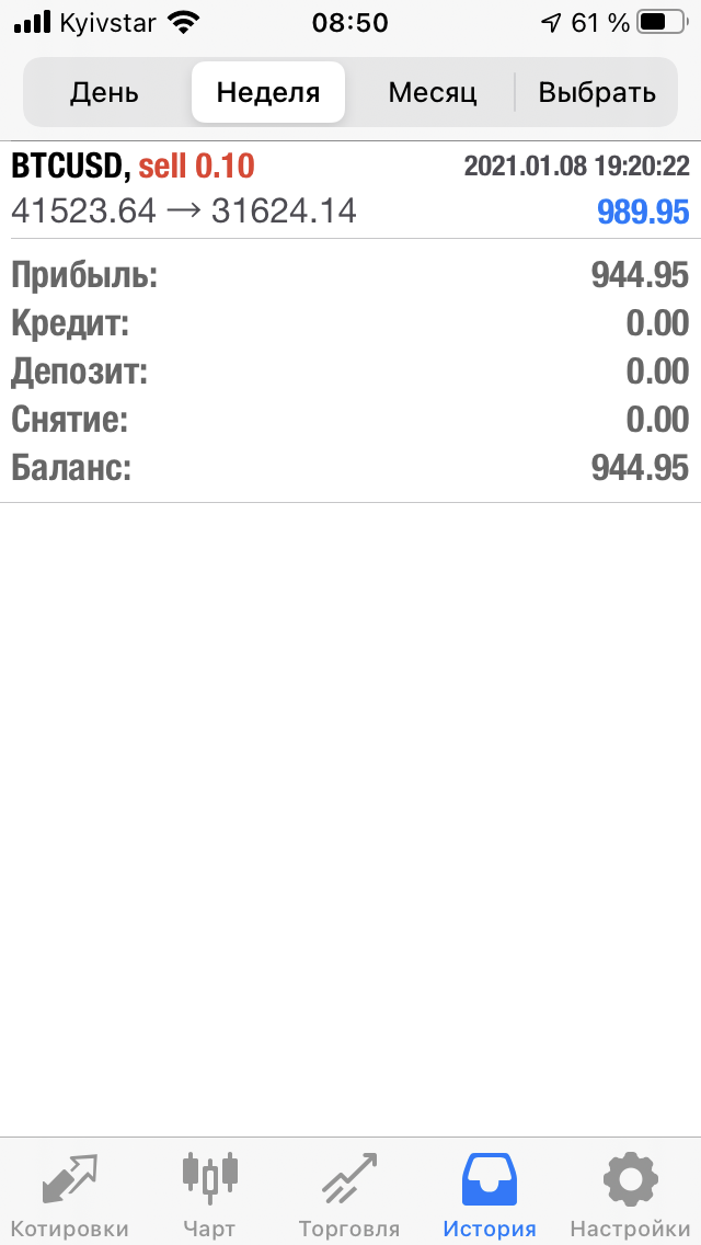 Так я про це і кажу. Якщо пофігу на ігрові гроші, то краще в реалі не починати. І не даремно написав про мінімум півроку в демо. Поки не зрозумієшь, що таке тренд, рівні і як воно працює, немає чого туди лізти. ПиСи. Заради приколу в демо версії відкрив ордер на продаж пари биток/доляр, всього лише 0.1 ордер. Враховуючи ціну невигідно воно. Вкладення набагато більше вихлопу. В цьому сенсі працювати з валютними парами набагато краще. Та і передбачуваніше.