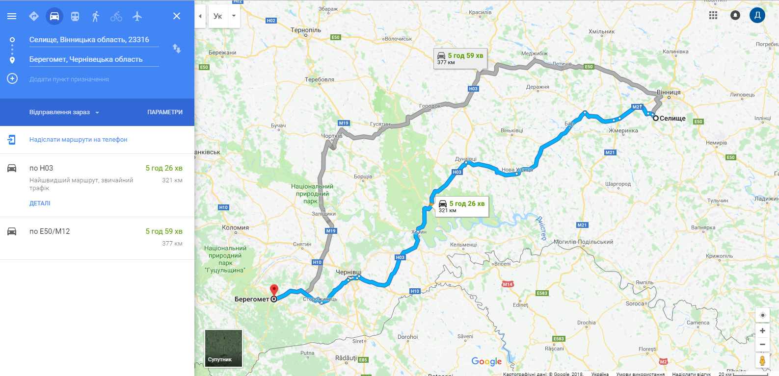 так, саме про неї, Е-50+Н-03. Вийти на середню 70 дуже проблематично. і мій гугл чомусь бачить маршрут через Бар всього лиш на 27 км коротшим, не на 50, як у Вас. І швидше всього на 10 хв. можливо, враховують погодні умови(?)