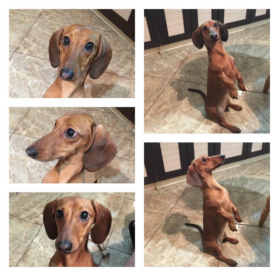 Наша Ева - 7кг. В стойку смирно - кстати тоже никто не учил и не думал даже такое! А получилось у нее сначала спонтанно за столом уперевшись чисто случайно и дальше у нас это вошло в привычку как верх попрошайничества все телом на полу сидим "выслуживаемся" когда кто то что то вкусненькое кушает Я никогда не думал что таксы на такое способны.