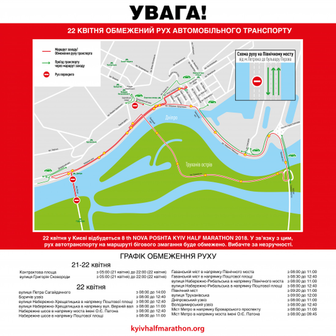 вулиця Петра Сагайдачного - 08:00 до 14:00 Боричів узвіз - з 08:00 до 12:40 вулиця Набережно-Хрещатицька в напрямку Поштової площі - з 08:00 до 12:40 вулиця Набережно-Хрещатицька в напрямку вул. Верхній вал - з 08:00 до 11:00 Набережне шосе в напрямку моста ім. Є. О. Патона - з 08:00 до 12:40 Набережне шосе в напрямку Поштової площі - з 08:00 до 11:00 Гаванській міст в напрямку Північного моста - з 08:00 до 11:00 Гаванській міст в напрямку Поштової площі - з 08:00 до 12:40 вулиця Набережно-Рибальська в напрямку Північного моста - з 08:00 до 11:00 Північний міст - з 09:20 до 11:00 вулиця Труханівська - з 09:00 до 12:00 Дніпровський узвіз - з 08:00 до 11:00 Володимирський узвіз - з 08:00 до 12:40 Міст Метро в напрямку Броварського проспекту - з 08:00 до 11:00 Міст Метро в напрямку моста ім. Є. О. Патона - з 08:00 до 09:45