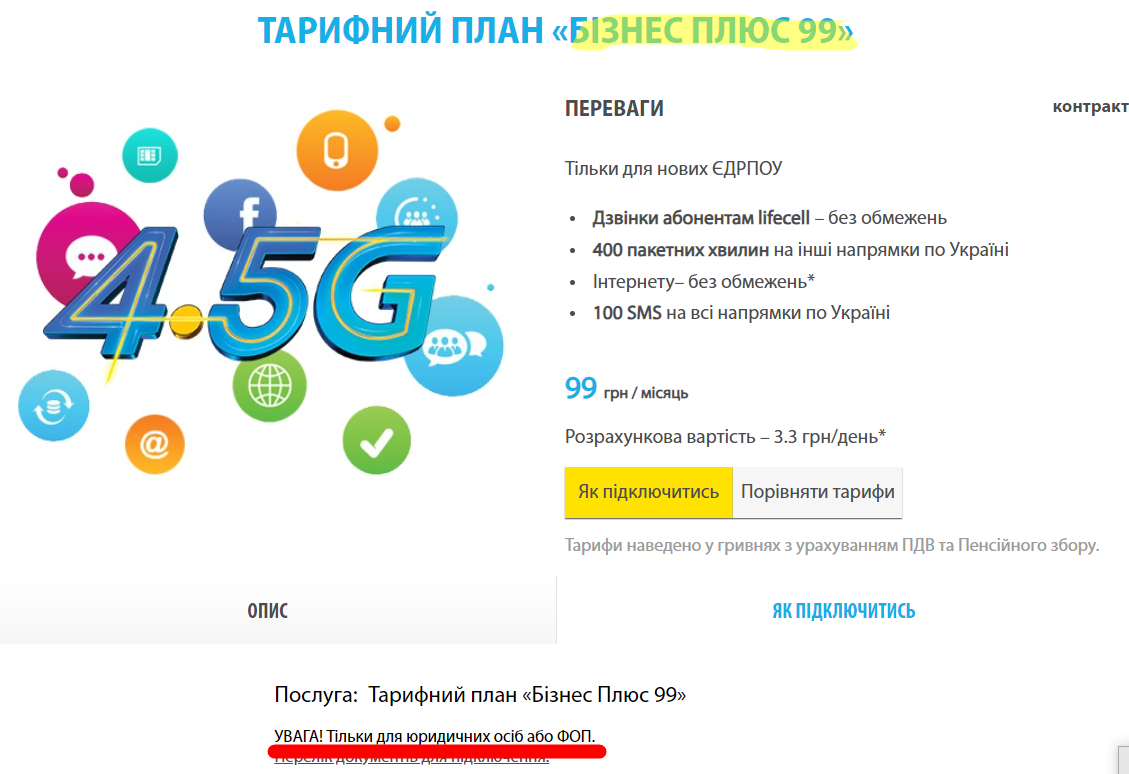 99 грн./місяць = БЕЗЛІМІТ 4G-інтернету + 400 хвилин для дзвінків по Україні + безліміт Лайфсел + 100 SMS