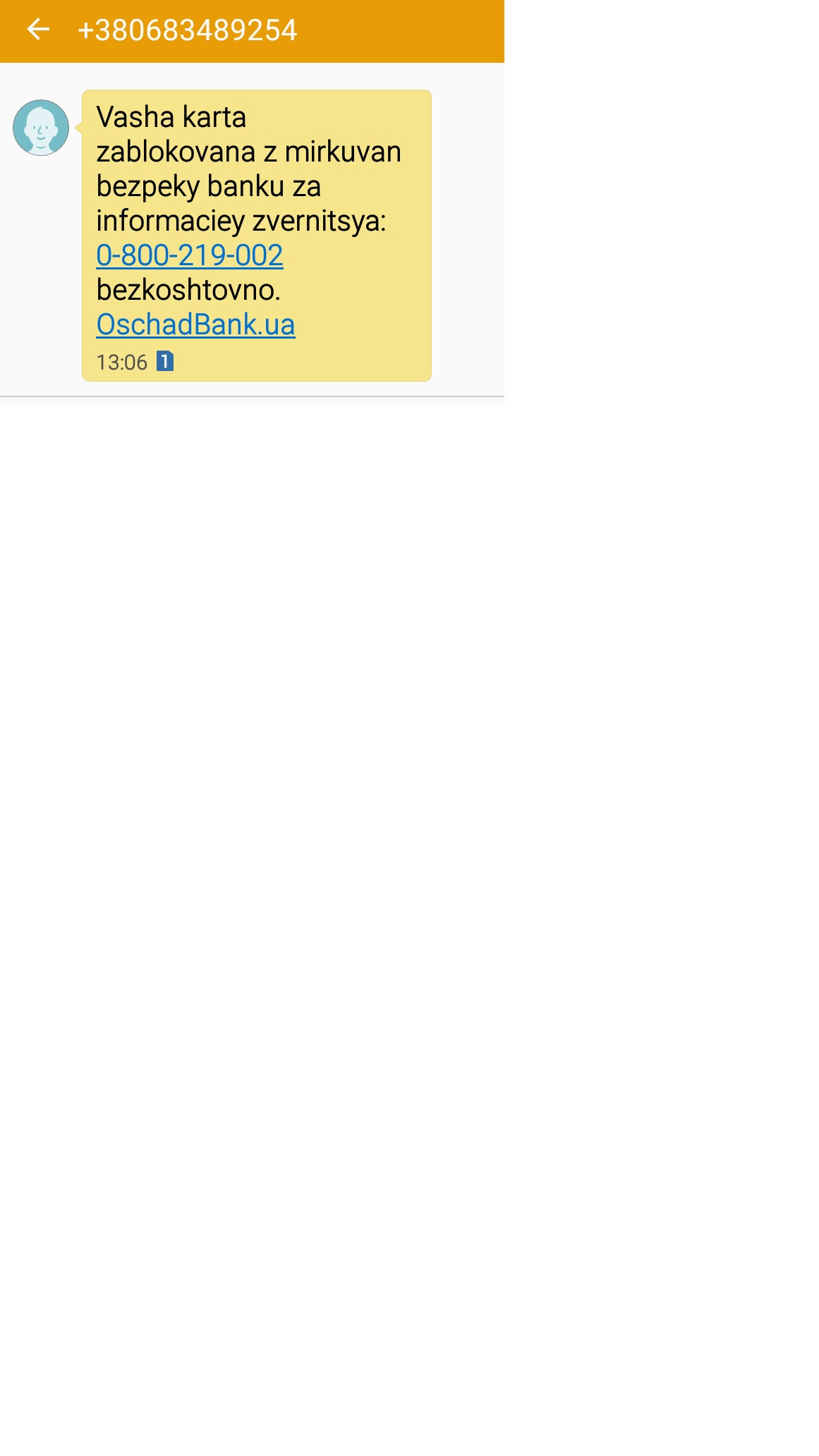 Shanovniy klient! Vasha karta bude zablokovana bankom. Terminovo proidit avtorizaciu zatelefonuite: +38(094)148-97-52 +38(050)598-13-12