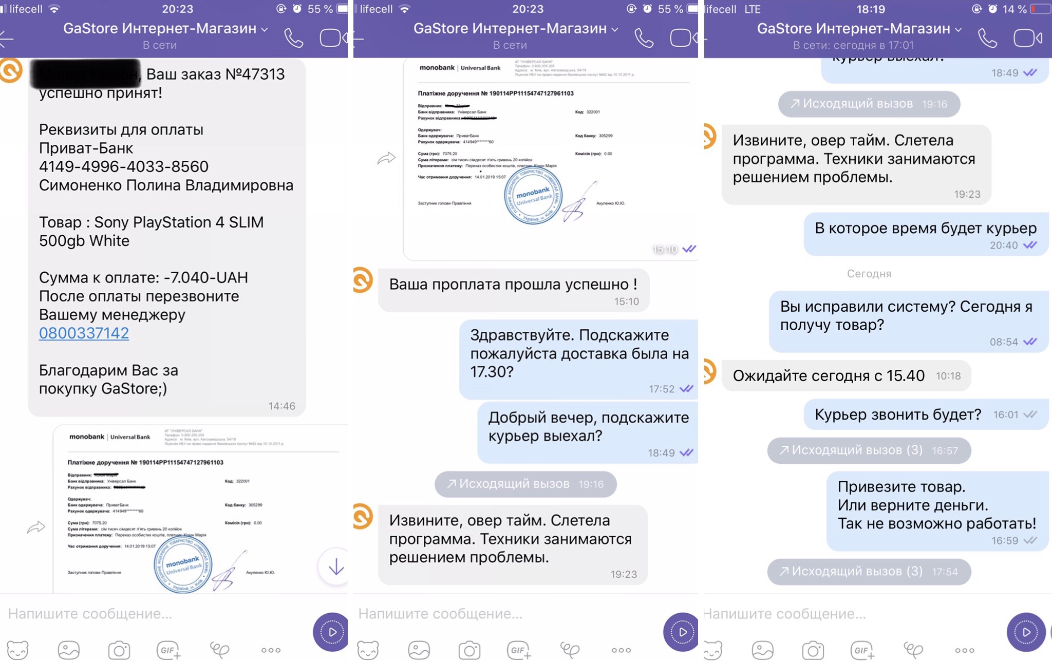 Текст что отправила в КиберПолицию: 14.01.2019 заказано було Sony PlayStation 4 SLIM 500gb White з сайту https://gastore.com.ua по акції за суму 7040 грн. Присвоєний номер заказу #47313 У 14.37 додзвонилася на номер, що представлений на сайті як менеджер - (063)-956-27-21. Менеджер уточнив призвіще та ім‘я, товар, що замовляю. Сказав, що через декілька хвилин перекине реквізити до оплати та передзвонить. Реквізити прийшли смс та повідомленням у VIBER. Через декілька хвилин дзвонить з`ясувати чи прийшли реквізити та сказав якщо оплата прийде протягом 40 хв то доставка товару буде о 16.30. О 15.07 через MonoBank перевела кошти 7040 грн + 35,20 (комісія) = 7075.20 грн загальна сума. В 15.10 прийшло повідомлення «Ваша проплата прошла успешно !» У 16.30 не було дзвінка від курьера та товар не приїхав. У 17.52 написала повідомлення , де запитувала чи не переплутала години доставки. У 18.49 вже запитала чи виїхав курьер. 18.17-19.16 намагалась додзвонитися хоть би за одним з номерів з їхнього сайту ( (063) 956 27 21 , (096) 538 44 30 , (044) 333 82 05 , (066) 839 61 73 ) але спроби були марними. У 19.16 подзвонила через систему VIBER на номер телефону через який писали( (099) 095 45 98 ) Трубку не взяли. Але в 19.23 відписали наступне «Извините, овер тайм. Слетела программа. Техники занимаются решением проблемы.» У 20.40 я уточнила в яку ж все таки годину повинен бути курьер. Відповіді не надійшло. Наступного дня 15.01.2019 о 9 годині відправила повідомлення у Viber з запитанням чи полагодили вони систему та чи отримую я замовлення. О 10.18 надійшло «Ожидайте сегодня с 15.40» У 16.01 запитала чи буде дзвонити курьер. 16.42-17.11 намагалася додзвонитися хоть би за одним з номерів з їхнього сайту ( (063) 956 27 21 , (096) 538 44 30 , (044) 333 82 05 , (066) 839 61 73 ) але спроби знов були марними. 16.46-16.57 подзвонила через систему VIBER 3 рази на номер телефону через який писали. ( (099) 095 45 98 ) О 16.59 написала повідомлення щоб привезли замовлення, або повернули кошти. 17.01 та 17.11 знову намагалася додзвонитися через VIBER ((099) 095 45 98 )