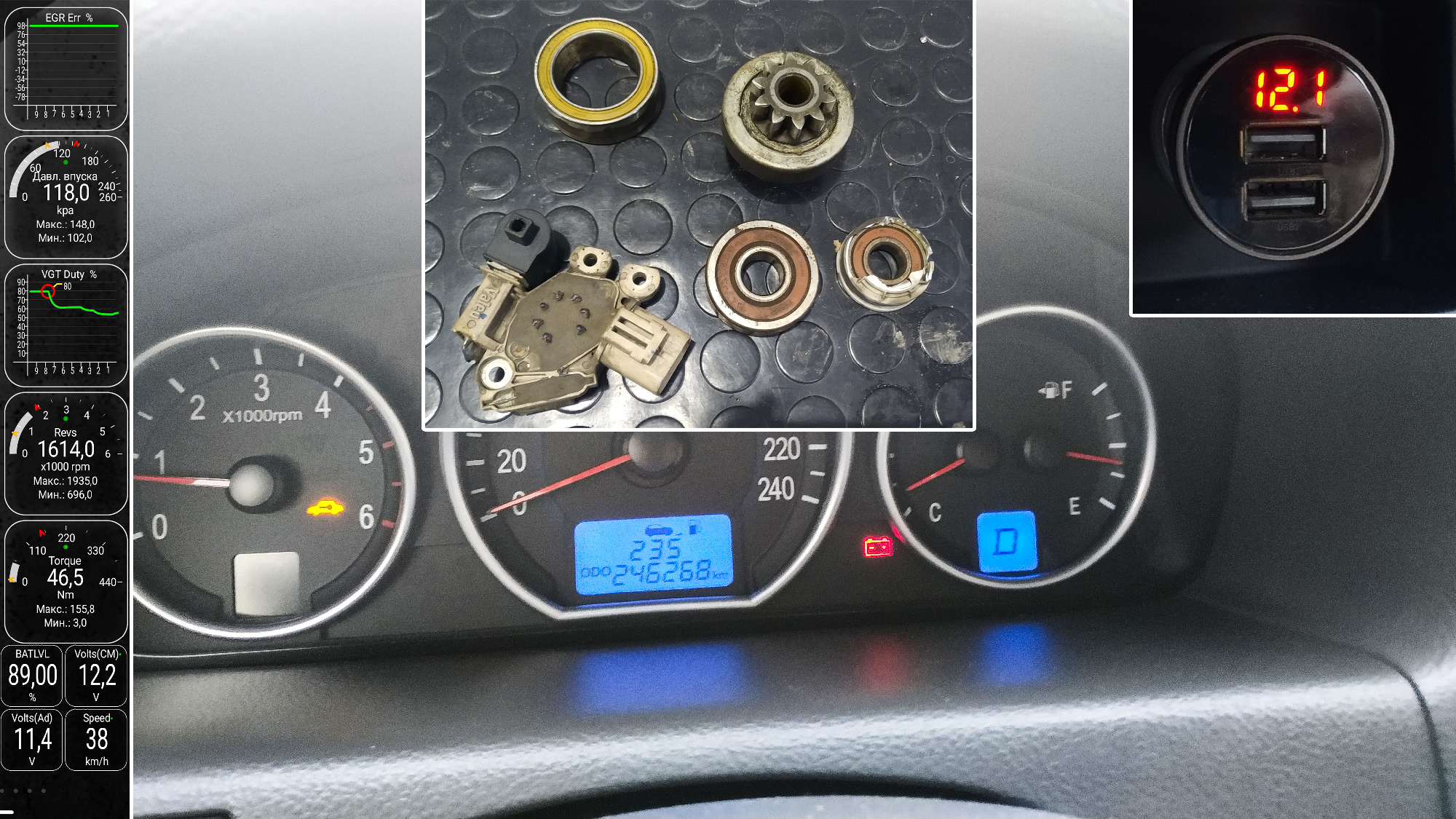 #Пробег 246 350 Нежданно негаданно получил на приборке значок аккумулятора при заведенном двигателе и упавшее напряжение в сети до 12В:) С дуру, думал глюк и накатал еще 80 км почти, пока дошло, что надо "шота сделать" В общем, проведена профилактика генератора и под шумок - стартера и компрессора кондиционера. Все равно все там рядом, компрессор еще и снимался, что бы к генератору добраться.