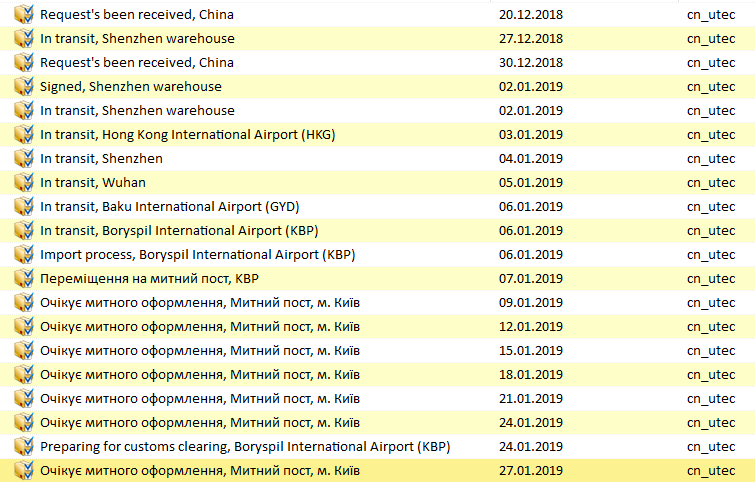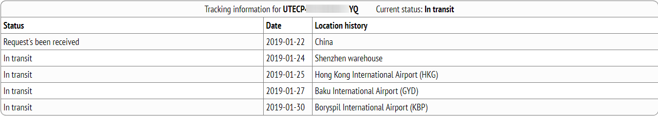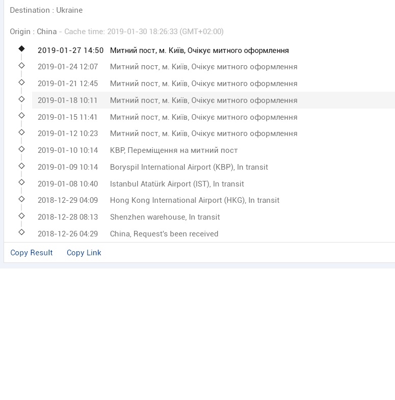 Статус посылки: В пути Назначение: Украина Отправитель: Китай 2019-01-30 15:28 Boryspil International Airport (KBP), Handling by airport 2019-01-30 10:39 Boryspil International Airport (KBP), Import process 2019-01-30 10:39 Boryspil International Airport (KBP), In transit 2019-01-27 04:38 Baku International Airport (GYD), Waiting for the departure from transit airport 2019-01-27 01:09 Baku International Airport (GYD), In transit 2019-01-25 04:21 Hong Kong International Airport (HKG), In transit 2019-01-24 12:07 Shenzhen UTEC warehouse, Warehouse processing 2019-01-24 11:09 Shenzhen warehouse, In transit 2019-01-24 10:55 Shenzhen warehouse, Signed