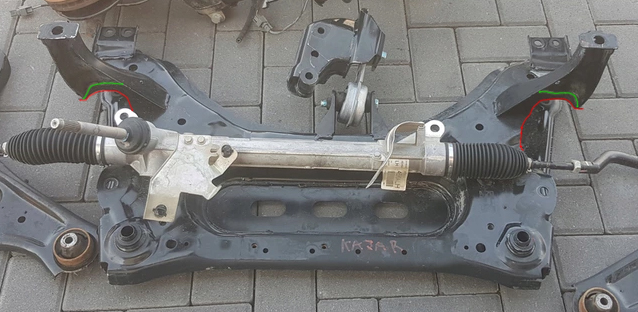 Ото и все? Тю, честно говоря, я ожидал большего Но я тебе сразу гвоздь забью: подрамник каджара точно такая же "плоская плита" как и у мегана - это просто кто-то пытается желаемое выдать за действительное Посмотри на те фото, что я раньше выкладывал, там, где оба подрамника видно чуть в профиль, а не сверху - конструкция точно такая же даже форма "труб" схожая до степени смешения Вся разница что у каджара есть оте два недоуха. Мне лень искать как оно там прикручено, но у меня есть большое подозрение, что они там просто из-за особенностей полноприводной трансмиссии. А учитывая, что они даже не цельные и приварены на краю верхнего слоя металла (см фотку, для тебя специально красным обвел где заканчивается верхний лист металла мега-подрамника от каджара и зеленым место сварки к нему "уха") то о какой-то "небо и земля" разницы в жесткости там и говорить не приходится. Не, сорян, камрад, но ты втираешь какую-то дичь. Да, подрамники не взаимозаменяемые и отличаются, но никакой принципиальной разницы в них нет вот совсем.