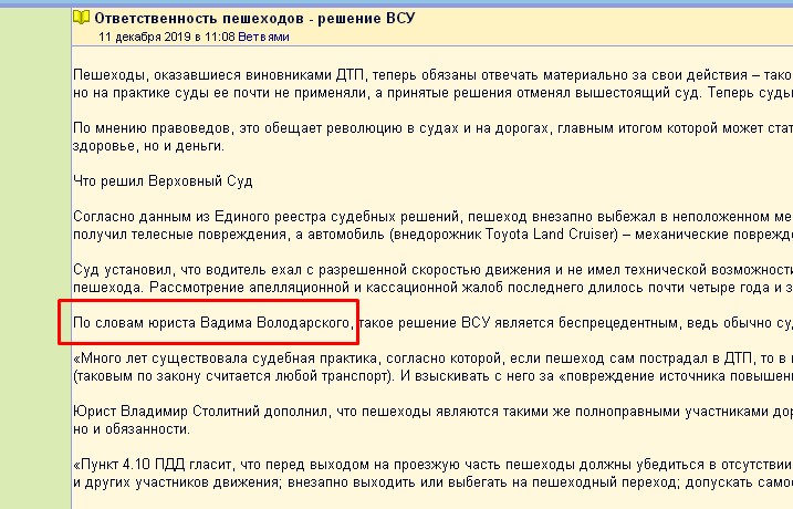 По словам юриста Вадима Володарского, такое решение ВСУ является беспрецедентным, ведь обычно суд высшей инстанции становился на сторону пешехода.