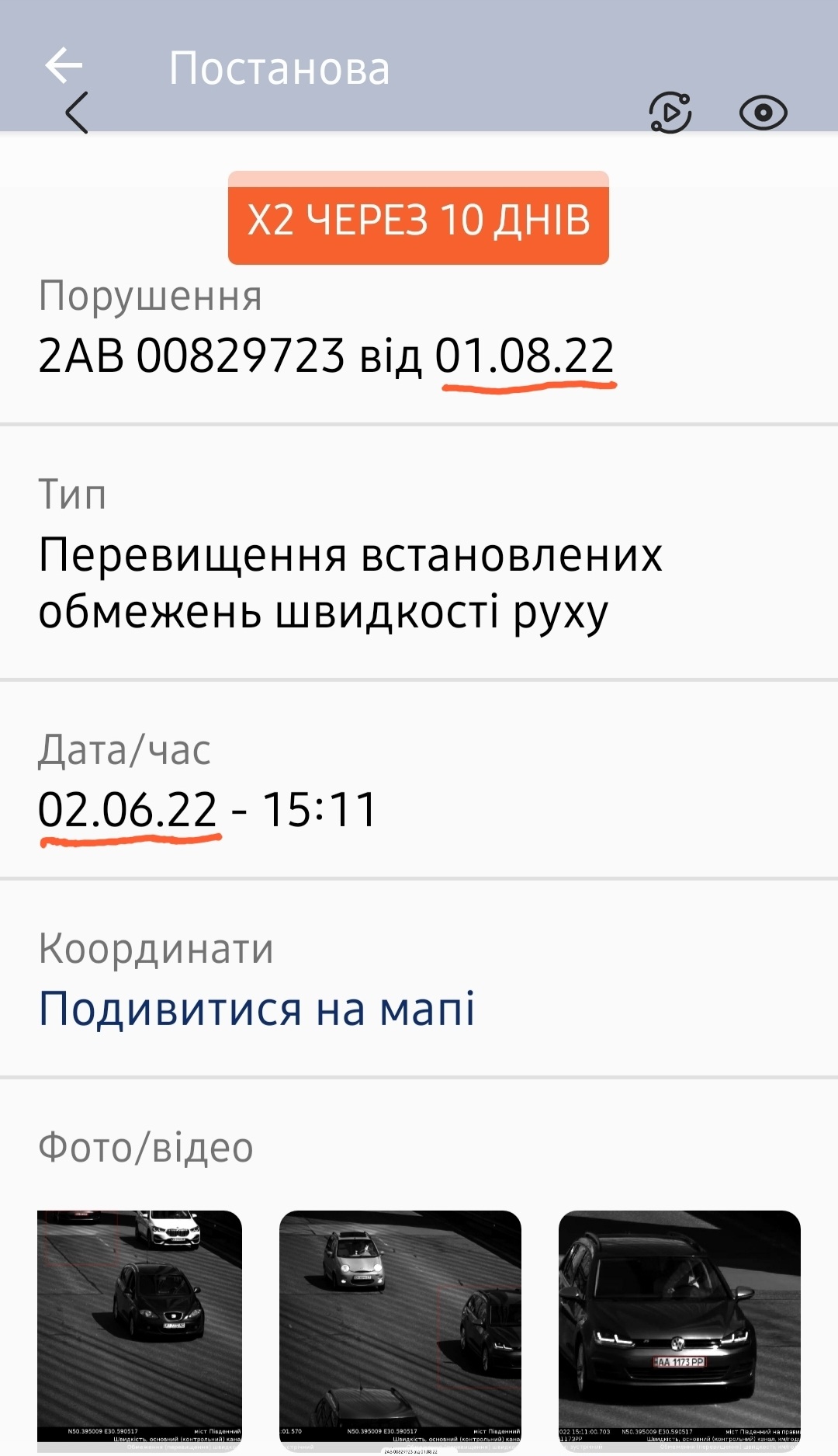 Отримав, сьогодн через додаток повідомлення про "несплачений штраф", відкриваю...й очам не вірю Порушення №***** від (увага!) 01.08.2022 Дата/час - (увага!) 02.06.2022
