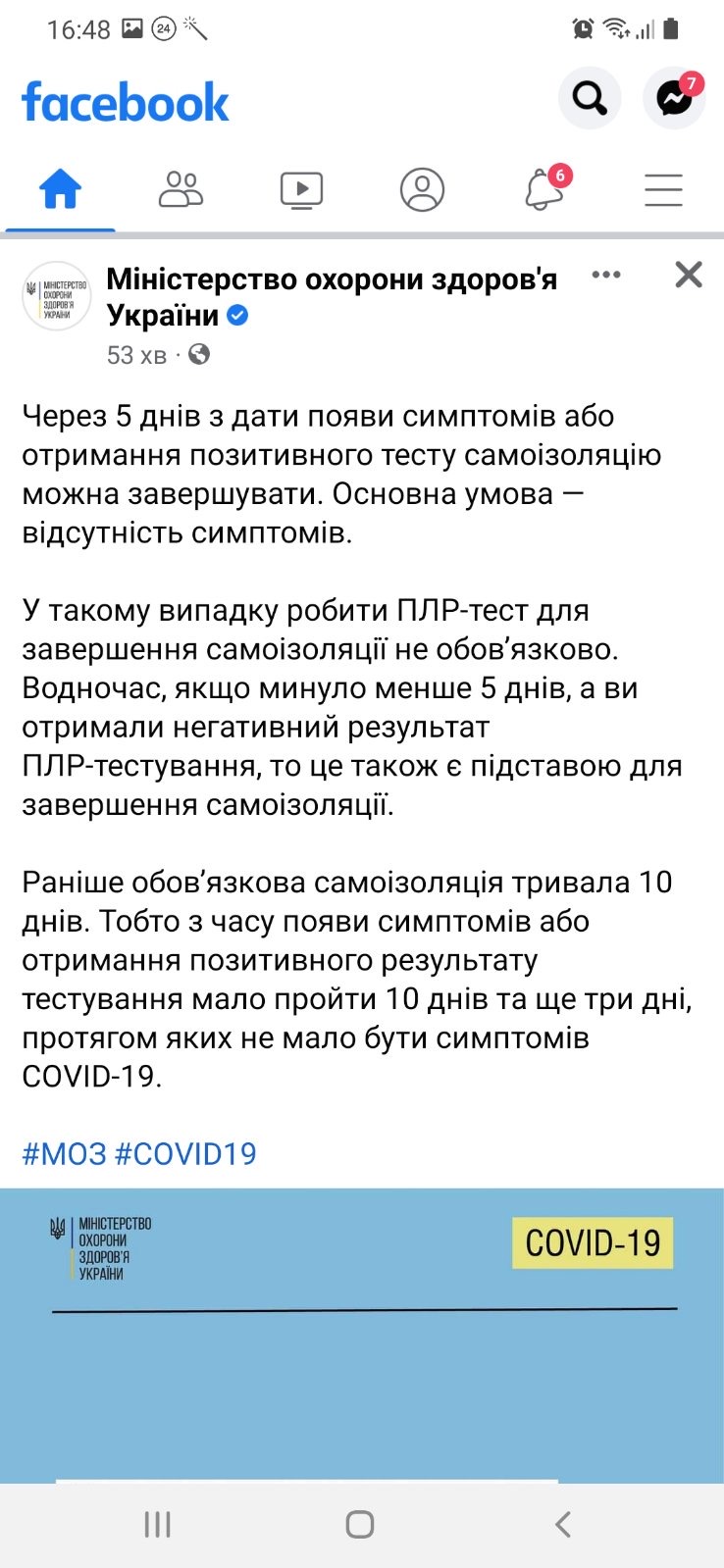 Також самоізоляцію можна завершувати за умови відсутності симптомів захворювання через 5 днів від дати їх появи або від дати отримання позитивного результату тестування.