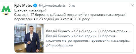 Відсьогодні, 17 березня, від 23-ої години київський метрополітен припиняє перевезення пасажирів. Попередньо до 3 квітня. Наземний пасажирський транспорт працює в штатному режимі, дублюючи лінії метро.