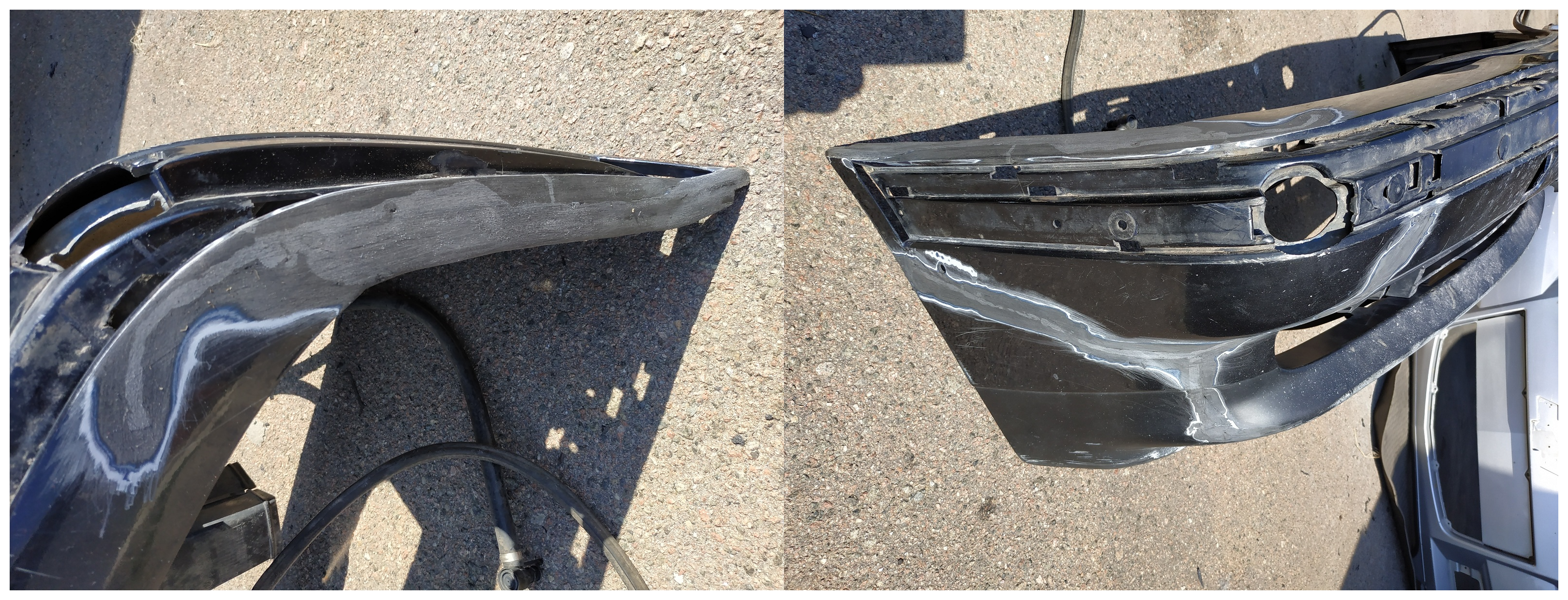 В качестве иллюстрации своей работы, прилагаю фото одного из восстановленных не так давно бамперов. Как видим, повреждение не слишком большое, но конкретное и при этом отсутствуют фрагменты правого верхнего уголка бампера. Пришлось вваривать кусочки от донора, и они туда очень даже неплохо вписались.