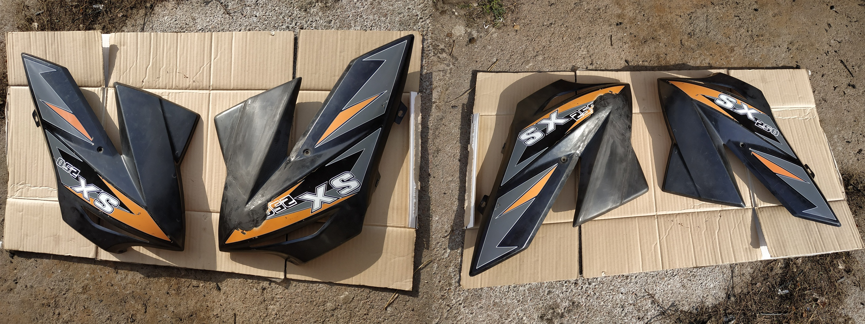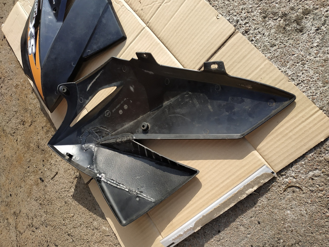 На фото до ремонта видно, что отсутствует приличная часть правого обтекателя, да еще и вырван кусок в верхней его части. К счастью, левый обтекатель остался цел, а по нему получилось восстановить и правый. Обтекатели идут под покраску и там вопрос уже решен, поэтому у меня была возможность не зашлифовывать слишком тщательно поверхность. Главная задача была восстановить всю геометрию, и повозиться пришлось изрядно. Для начала с целого обтекателя снял размеры и сделал выкройки, а потом по ним, в зеркальном отражении, сварил по частям всю недостающую часть разбитой детали. Что получилось в результате, видно на фото.