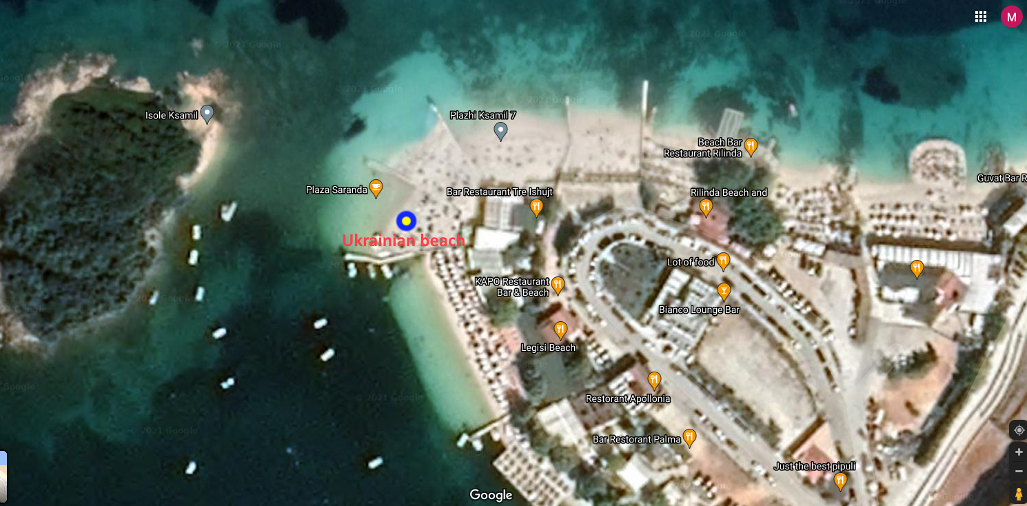 . Це місце можна називати українським пляжем. Сьогодні тільки в цьому секторі відпочивало 14-16 українських сімей. Після автомобілів з албанськими номерами, наступними по кількості наші. Географія велика. Від Києва до Одеси, від Полтави до Львова.