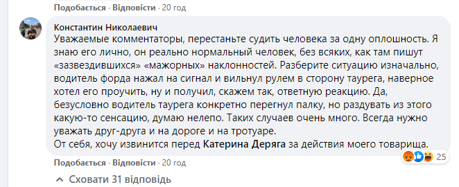Схоже що вже порішали і відкупився. Дивують і такі "постраждалі". Нащо приймати ті гроші від нього, якщо він публічно навіть не вибачився, а розповідає, що "вишел пагаварить"? Я готовий скинутися на ремонт того авто, та на лікування, тільки б того когута посадили хоч на пару років.