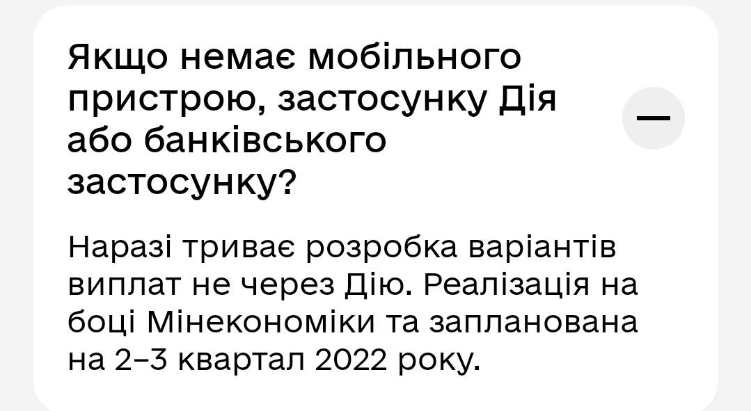 Имхо если они что-то и придумают, то это будет гораздо сложнее, чем купить в супермаркете карту Монобанк, дистанционно дома открыть счёт и поставить приложение Дия. Думаю через центры социальных услуг будут банк карты давать или сначала оформить документы в центре и потом идти в Ощадбанк/ПриватБанк и заказывать карту е-поддержка. А это все очереди и время. Вообщем на лёгкость получения этой карты без Дии я бы не рассчитывал с нашим государством
