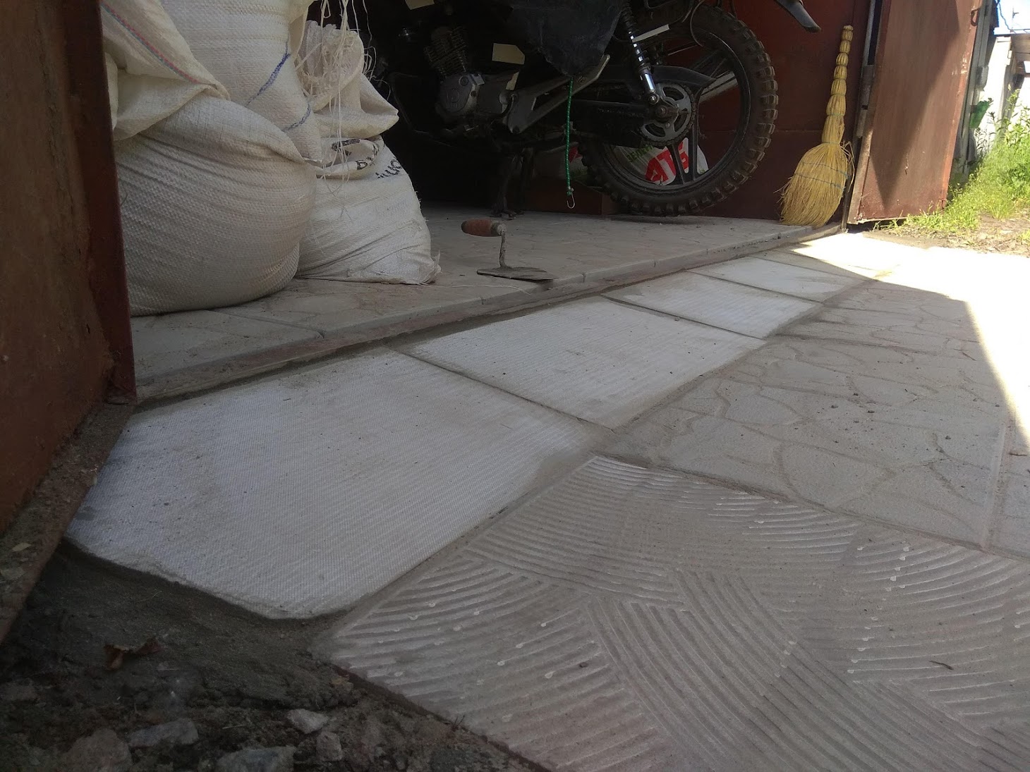 Эта плитка 30на30 см укладывается очень просто, а физ.нагрузка очень полезна! Уровень - да, минимум на 4 см поднимет, нужно хоть немного песка на бетон подсыпать.