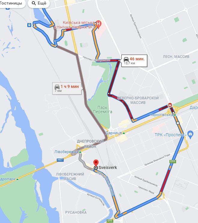 Причем что характерно такая картина не меняется с 8.00 до 20.00 Вы как поедете, по короткой 7 км за 1,09 или в два раза длиннее но за 45 мин? Стоит даже Радужная, гугл предлагает чуть сократить свернув за озером, проехав через станцию "Троещина", чтобы потом чуть ближе выехать на туже Радужную. просто нет слов.