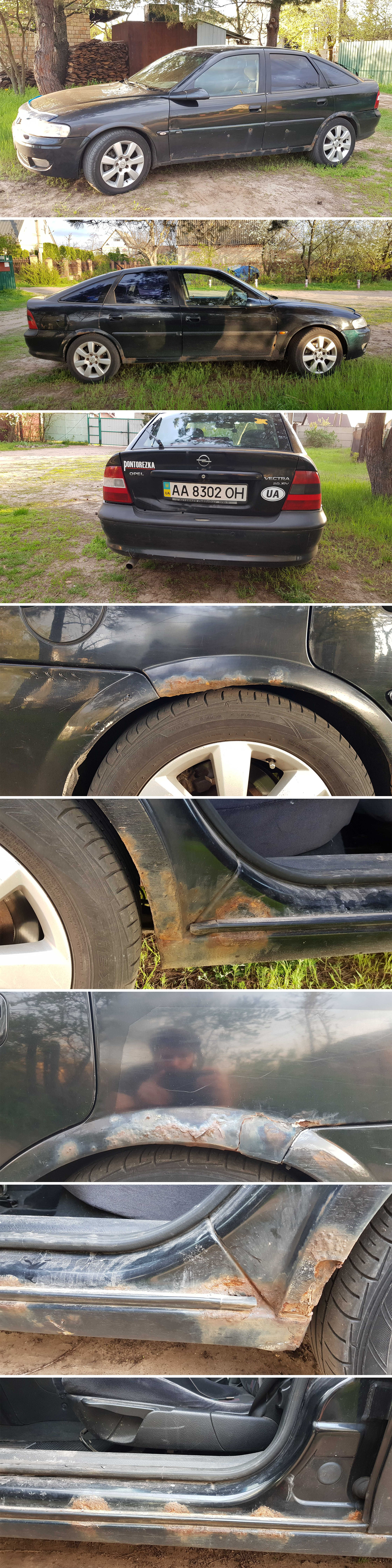 Три месяца назад я в очередной раз задумался о полном перекрасе своей старушки Opel Vectra B. Состояние машины было плачевное, сгнившие пороги и арки, и сливные отверстия в днище, почти вся кузовня с очагами ржавчины, плюс небольшой удар в [*****]. Ясное дело что дешевле продать и купить машину свежее, и что полный перекрас никогда не отобьется при продаже и т.п. Но машина нравится, хотел сделать для себя и кататься дальше.