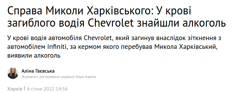 Це лише привід осудити водія шевроле по 130й адмінкодексу посмертно, чи захисту миколайчика сказати "ай-яй-яй! Він впоживав за кермом!", до ДТП цей факт відношення не має. Ну і невідомо у якій кійлькості був той алкоголь, алкоголь у крові є завжди.