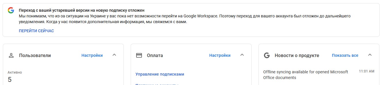 Переход с вашей устаревшей версии на новую подписку отложен Мы понимаем, что из-за ситуации на Украине у вас пока нет возможности перейти на Google Workspace. Поэтому переход для вашего аккаунта был отложен до дальнейшего уведомления. Когда у нас появится дополнительная информация, мы свяжемся с вами.