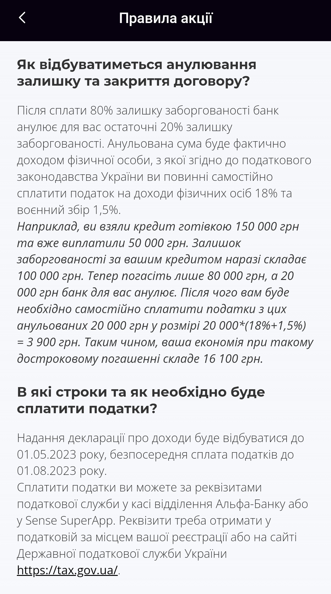 Там ще нюансік, ці прощені 20% будуть вважатись прибутком і з них треба самостійно сплатити 19.5% податків. Імхо, не вестися на халяву, а продовжувати гасити по плану.