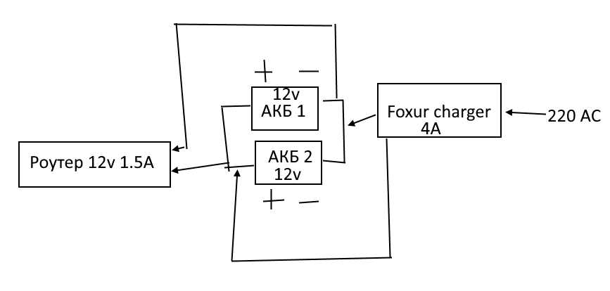 Хтось пробував робити "УПС" для роутера 12V зі звичайного АКБ для УПС-а (типу такого), під'єднувати до нього зарядку типу такої , та від клем живити роутер? Якщо є світло - йде заряд АКБ та живиться роутер; світла немає - роутер живиться від АКБ. Нічого перемикати не треба. Чи не буде АКБ перезаряджатися, бо там зарядний струм 4A? А якщо взяти 2 АКБ паралельно, струм на кожну АКБ буде зменшено вдвічі, що вже майже ок? Взагалі ідея має право на існування?
