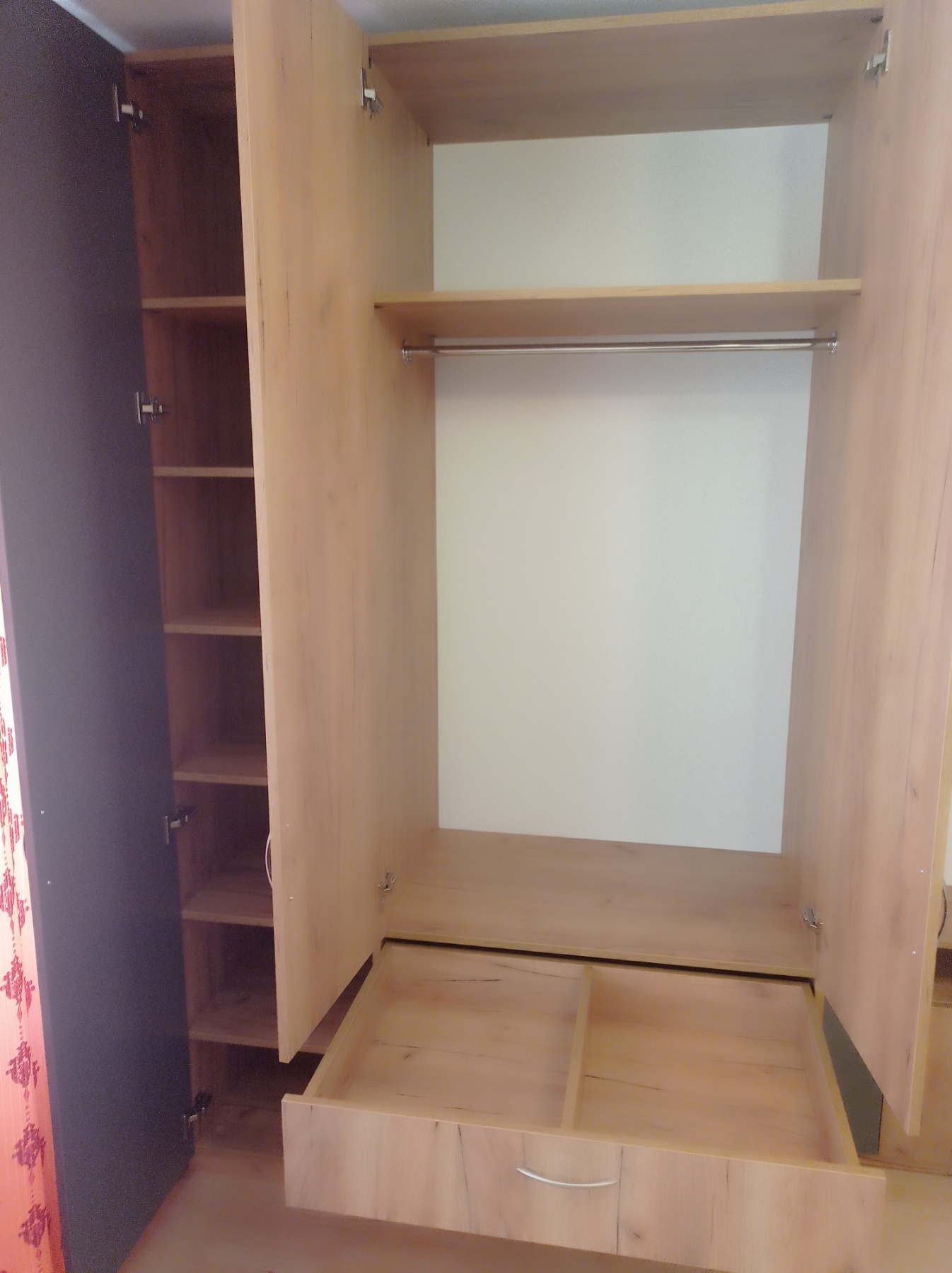Шафа в кімнату Каркас ДСП Кроношпан Дуб Крафт Золотий 18мм Крайка по периметру Фасади ДСП Кроношпан Дуб Крафт Золотий 18мм Фасади ДСП Кроношпан Графіт 18мм Крайка 2мм + ПУР клей Задня стінка ДВП Кроношпан Білий 3мм Ніжки Маехеттен 50мм Швидкозйомна фурнітура Хетіч Завіси Мюллер з дотягувачем Направляючі прихованого монтажу Мюллер з дотягувачем.