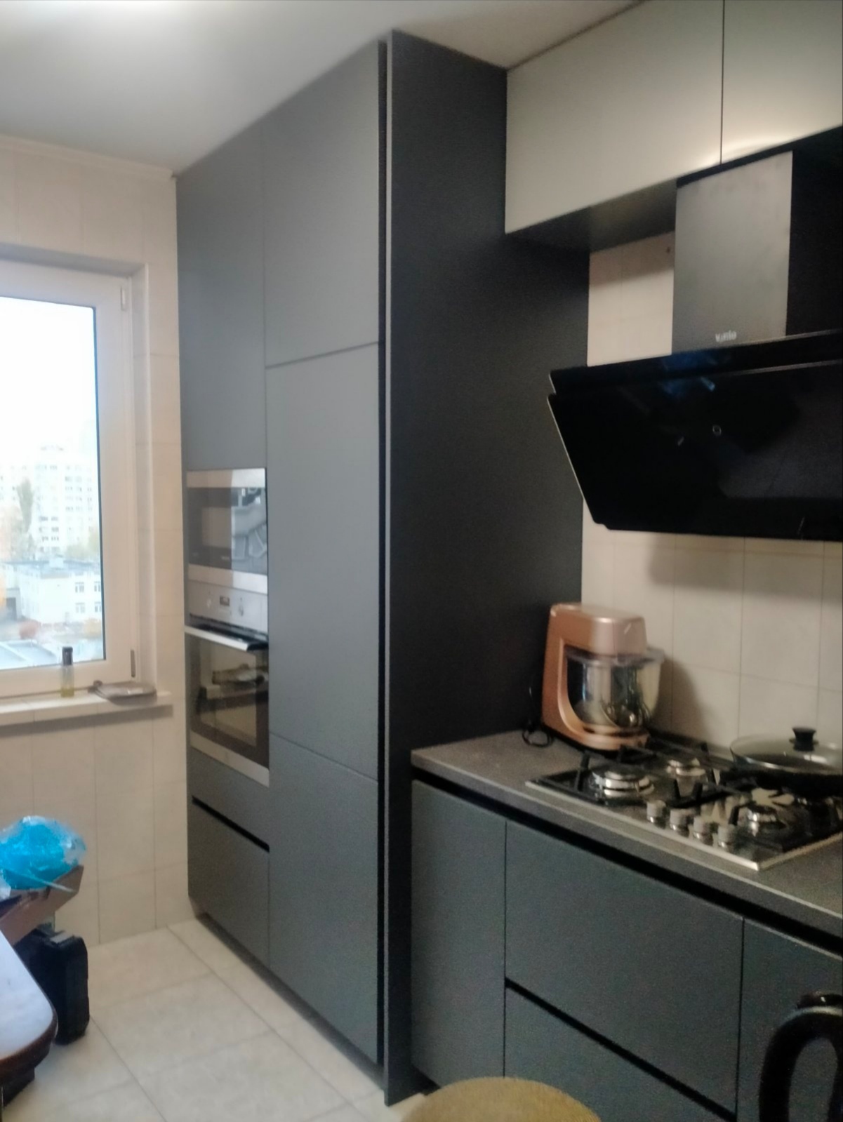 Кухня Каркас ДСП Кроношпан 18мм Крайка 2мм та 0.8мм + ПУР клей Стільниця Вологостійка Кроношпан 38мм Фасади Акрилова плита Niemann Крайка Лазер Завіси Blum Направляючі прихованого монтажу з дотягувачем Blum, Ручка профіль Gola горизонтальна + вертикальна Фасади на кутовій тумбі Алюмінієвий профіль + скло Підйомний механізм Blum Aventos HF Top Сушка Inoxa