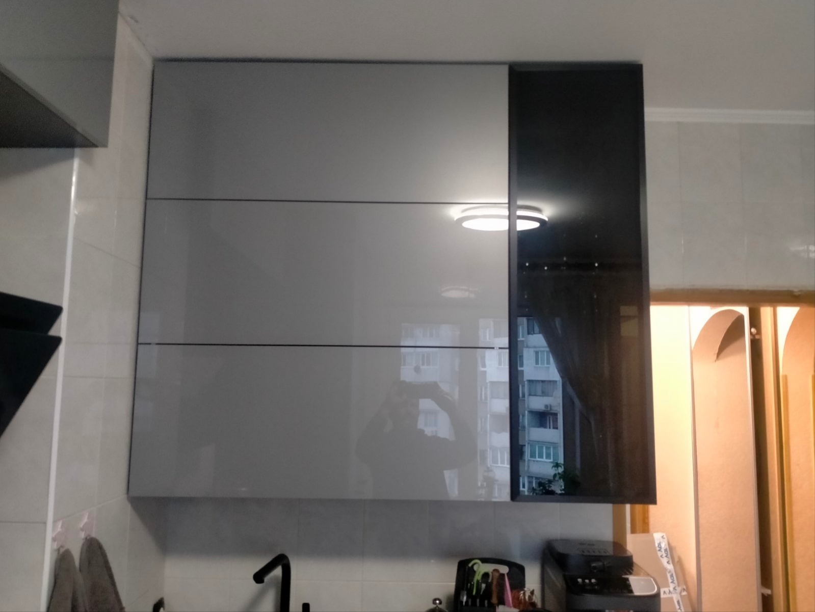 Кухня Каркас ДСП Кроношпан 18мм Крайка 2мм та 0.8мм + ПУР клей Стільниця Вологостійка Кроношпан 38мм Фасади Акрилова плита Niemann Крайка Лазер Завіси Blum Направляючі прихованого монтажу з дотягувачем Blum Ручка профіль Gola горизонтальна + вертикальна Фасади на кутовій тумбі Алюмінієвий профіль + скло Підйомний механізм Blum Aventos HF Top Сушка Inoxa.
