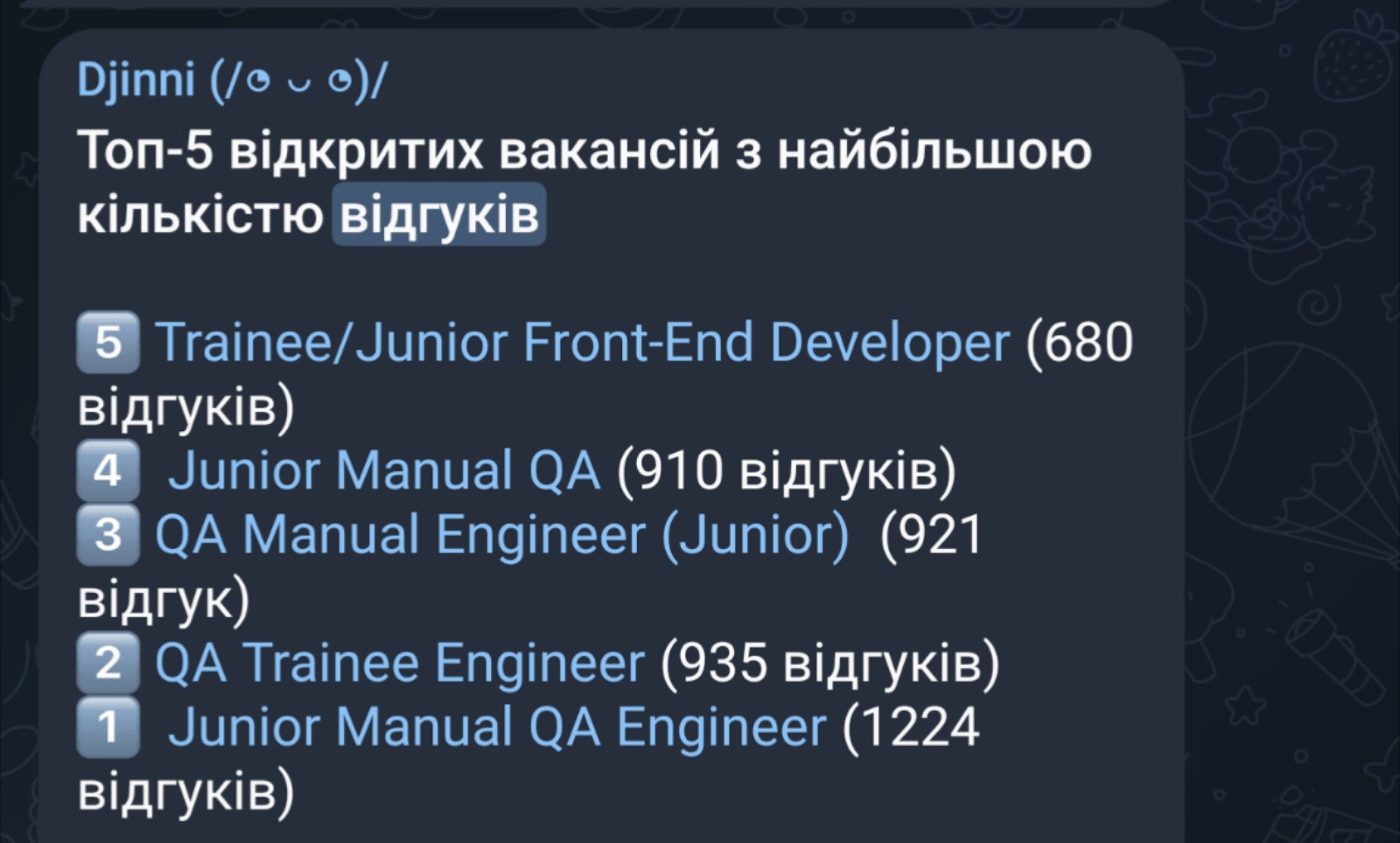 Якщо вірити доу, то .NET входить у топ 4 по кількості вакансій зараз. Але тут інше потрібно дивитись - це відгуки на вакансію без досвіду. Так от для для QA без досвіду - в середньому 358 кандидатів на одну вакансію . JavaScript - 273, Python - 150, .NET - 28
