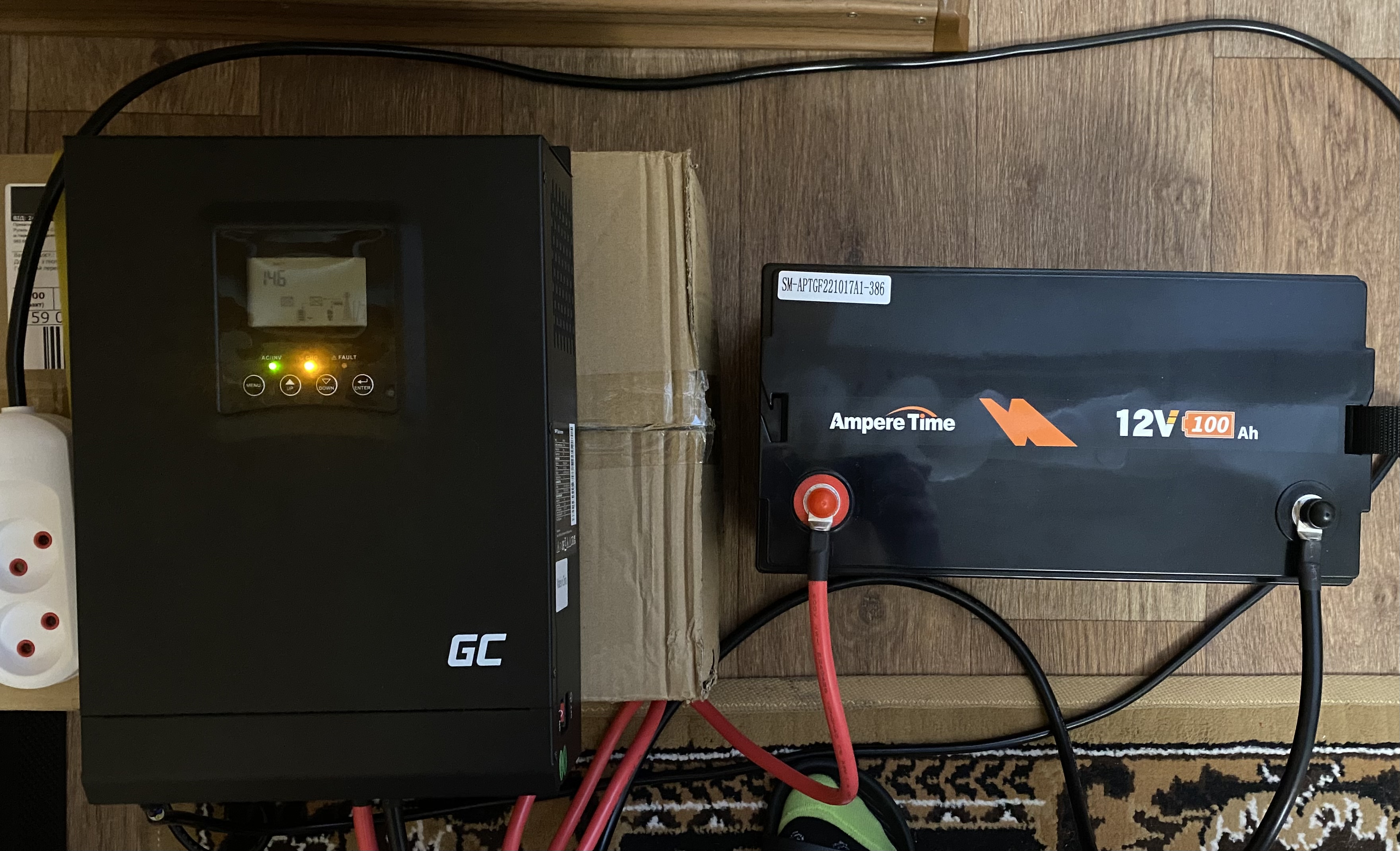 Гібридний інвертор 1 Квт і lifepo4 батарея 12в 100аг Зі споживанням квартири до 200вт/год повинно вистачити на 5 год. Поки все на підлозі, далі планую змонтувати біля електрощита з ручним перемиканням міська мережа - інвертор.
