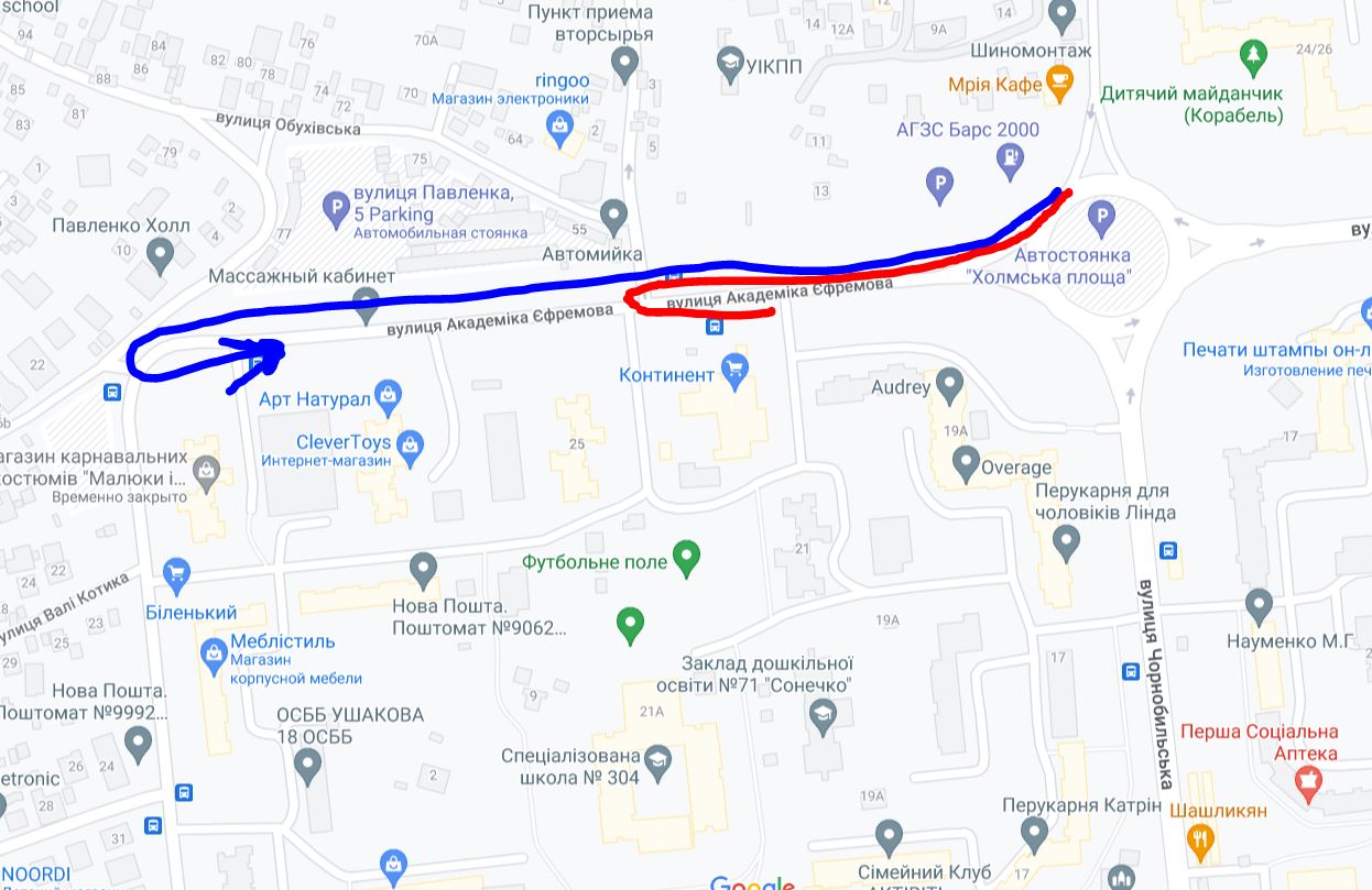 Раніше на перетині Єфремова та Осіннього провулка був розрив. А зараз там подвійна суцільна, світлофор і розгортатись тепер можна лише наприкінці Єфремова, де вона межує з вулицею Ушакова. Синім на фото як зараз, червоним – як було