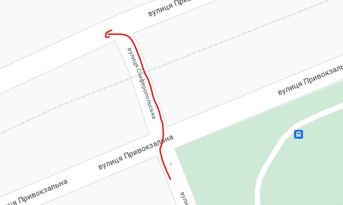 Перехрестя обмежене проїзною частиною Сімферопольської, з якої ти виїжджаєш. Якщо я їду Привокзальною праворуч від тебе й мені потрібно розгорнутися - де саме я це маю зробити, якщо знаком мені дозволений розворот (або просто знака немає й є тільки цеглина на в'їзді до Сімферопольскої)? Я як раз там й буду починати маневр розвороту, де проходить твоя синя траєкторія й буду його виконувати по ній у частині перетину трамвайних колій.