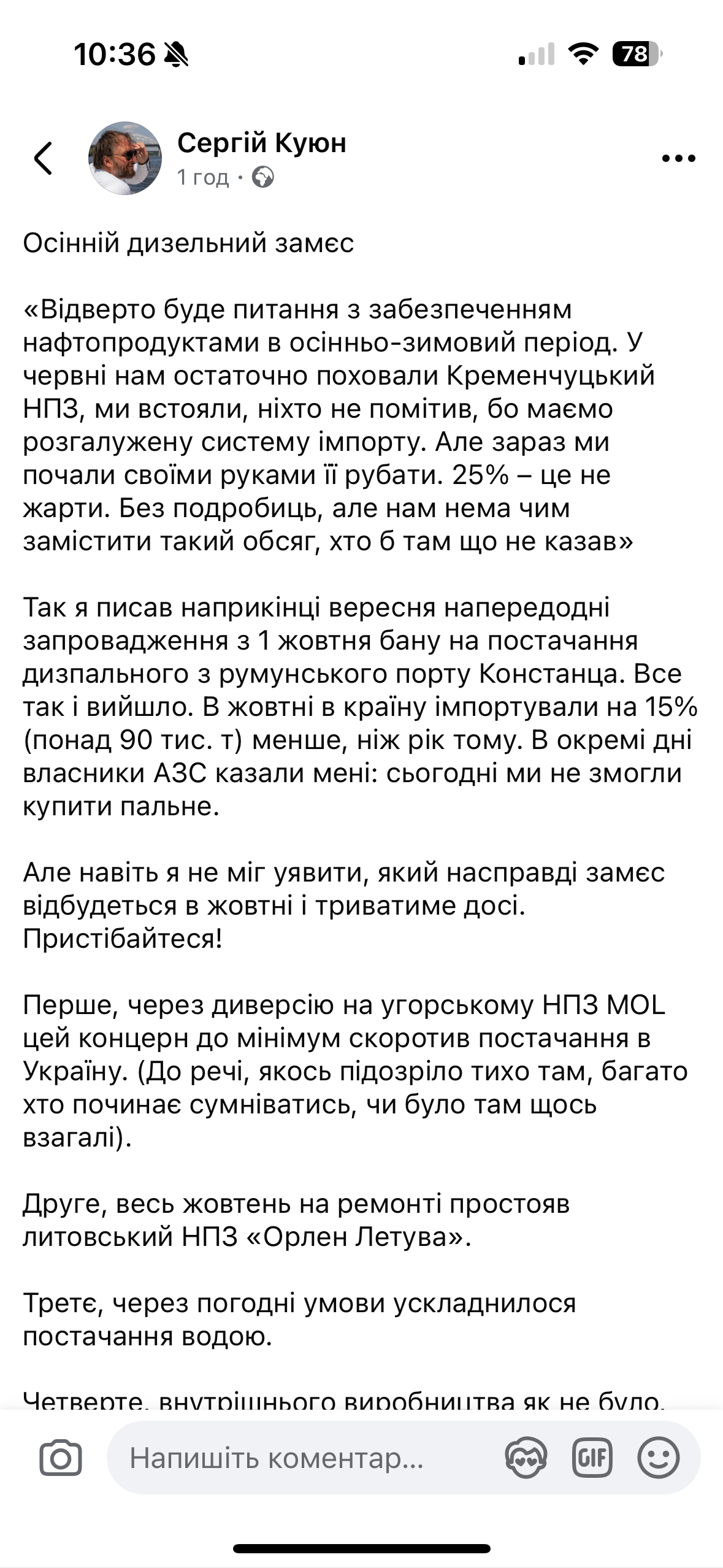 «Сергій Куюн Осінній дизельний замєс «Відверто буде питання з забезпеченням нафтопродуктами в осінньо-зимовий період. У червні нам остаточно поховали Кременчуцький НПЗ, ми встояли, ніхто не помітив, бо маємо розгалужену систему імпорту. Але зараз ми почали своїми руками її рубати. 25% – це не жарти. Без подробиць, але нам нема чим замістити такий обсяг, хто б там що не казав»