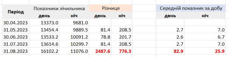 Із великих приладів у мене є: 1. Фільтрація басейна, працює 14 годин на добу - але він працює в такому режимі з травня місяця. 2. Тепловий насос - гріє воду і теплу підлогу, налаштування не змінювались. 3. Три кондиціонера - в червні-липні працювали більше ніж в серпні.