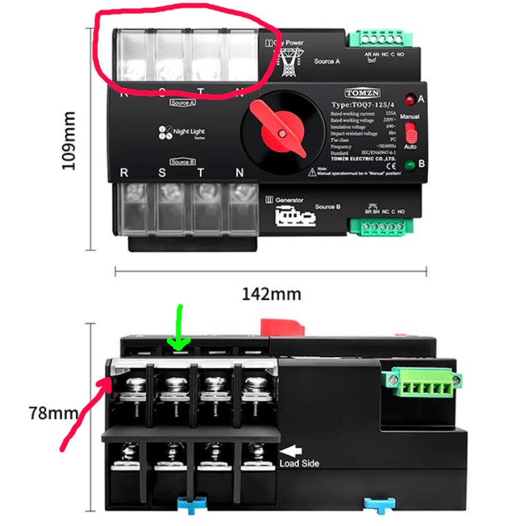 Нашел в гугле картинку, правда на ней эта самая крышка вровень. У меня не Tomzn, а Geya - эти крышки индивидуальные на каждый контакт и они выпирают за плоскость пластика корпуса. Зеленой стрелкой на фото указаны пазы, в которые защелкивается крышка. Красной стрелкой указано, где крышки опираются на корпус АВР (помимо защелки). Вот эти самые места упора на крышке подрезаются на нужную высоту, чтобы крышка защелкнулась ниже на один паз (там их несколько) и стала вровень с пластиком корпуса. Сфотать не могу, т.к. оно все давно в щите собрано. Но думаю, что по описанию понятно, о чем я