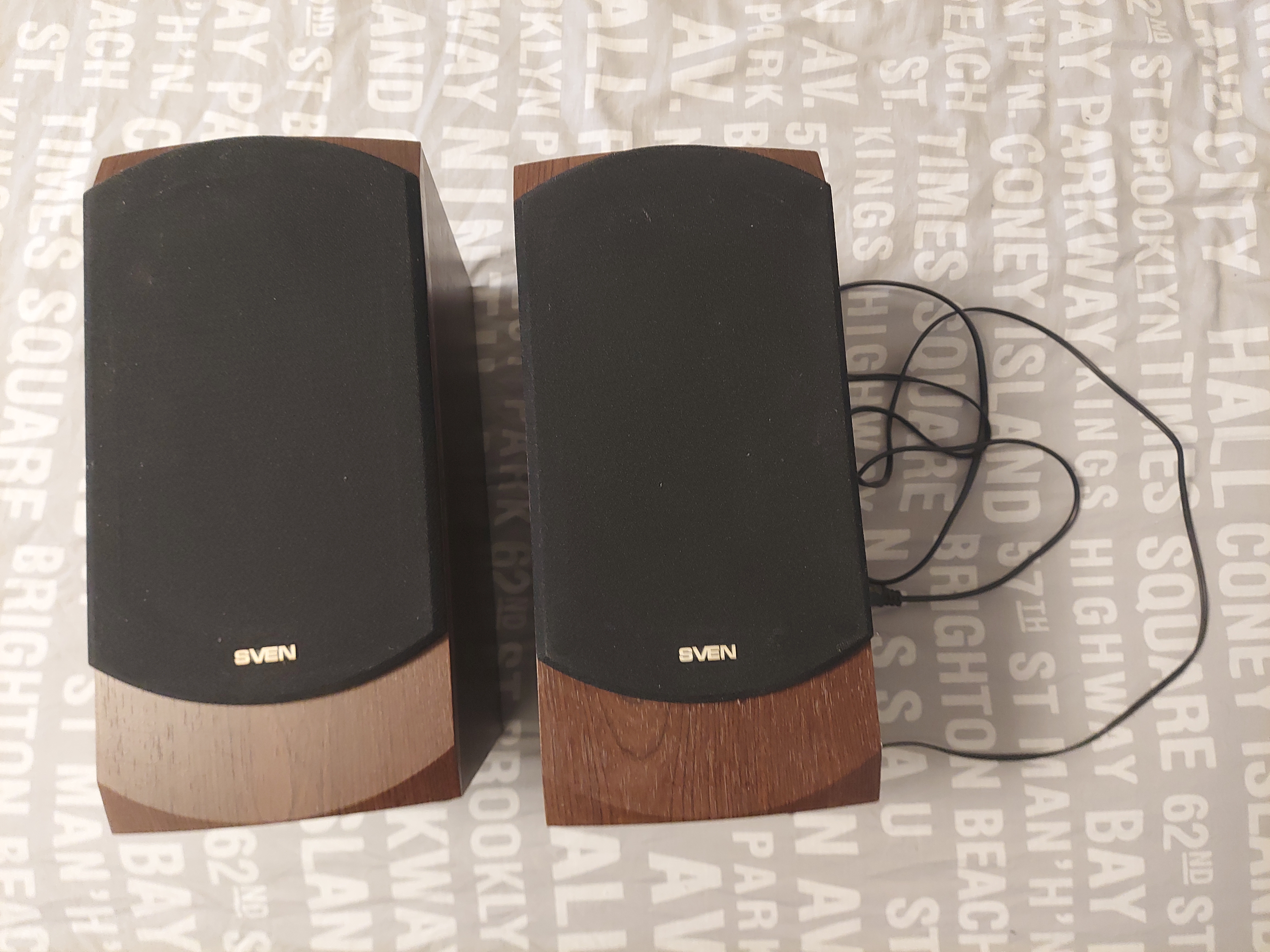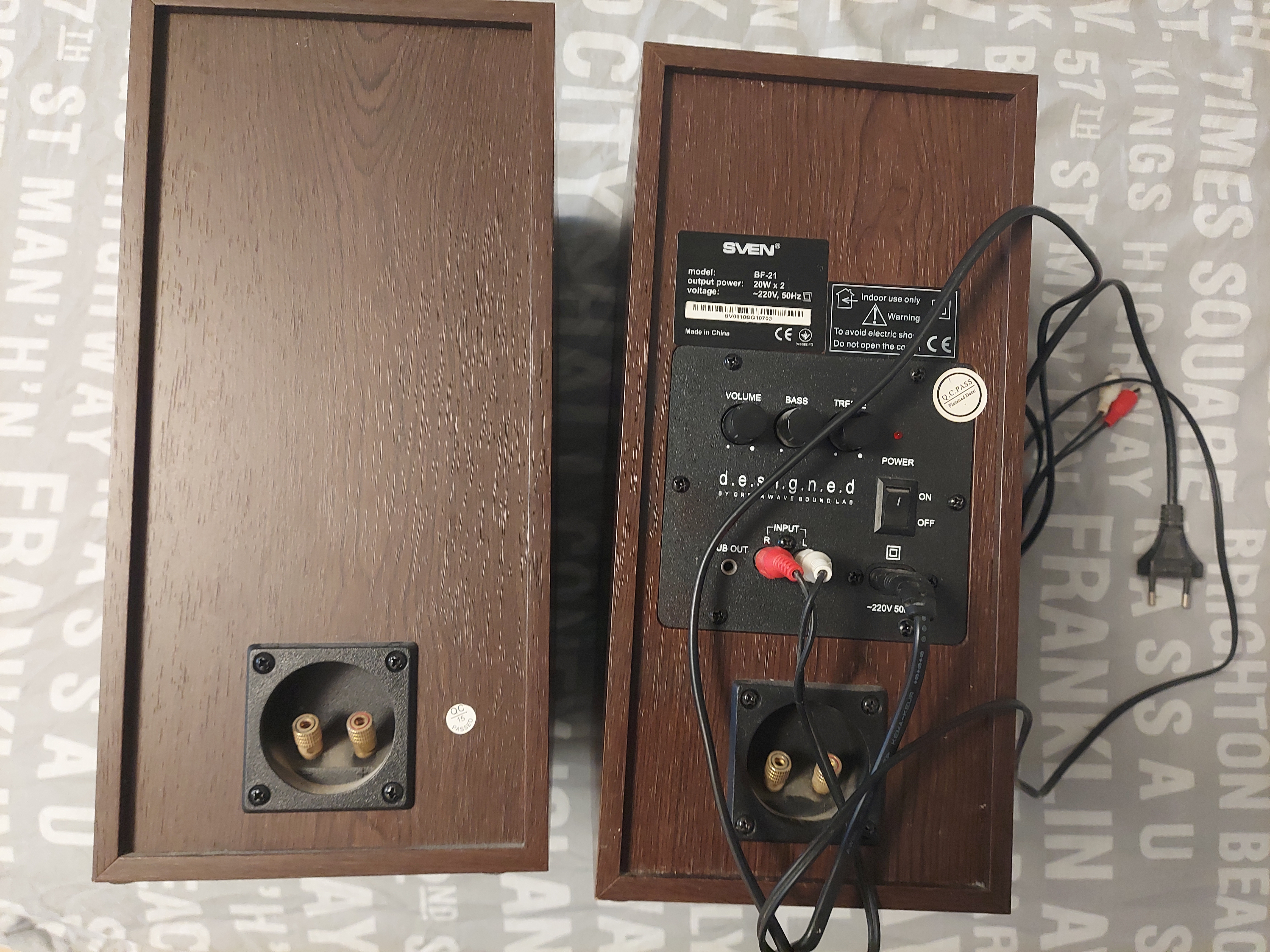 (П) акустичну систему (2 колонки) SVEN BF-21. Стан: б/у. Выходная мощность (RMS), Вт 40 (2 × 20) Частотный диапазон, Гц 35 – 20 000 Соотношение сигнал/шум, дБ ≥ 75 Диаметр ВЧ-динамиков, мм Ø 25 Диаметр НЧ-динамиков, мм Ø 100 Магнитное экранирование есть Напряжение питания ~220 В, 50 Гц Номинальный ток потребления, А 0,34 A Типы входов 2 RCA Материал корпуса дерево (MDF) Размеры, мм 150 × 310 × 232 Вес, кг 7,5