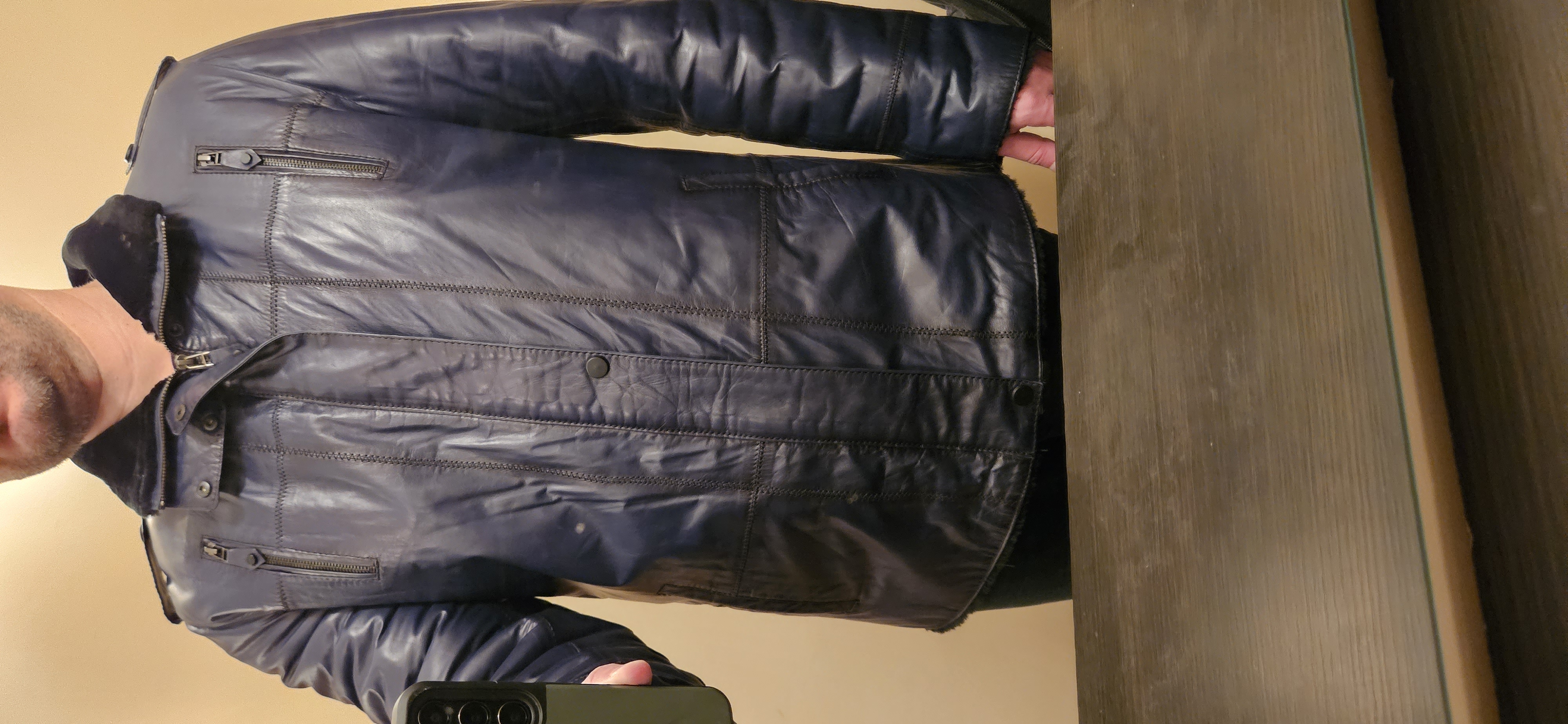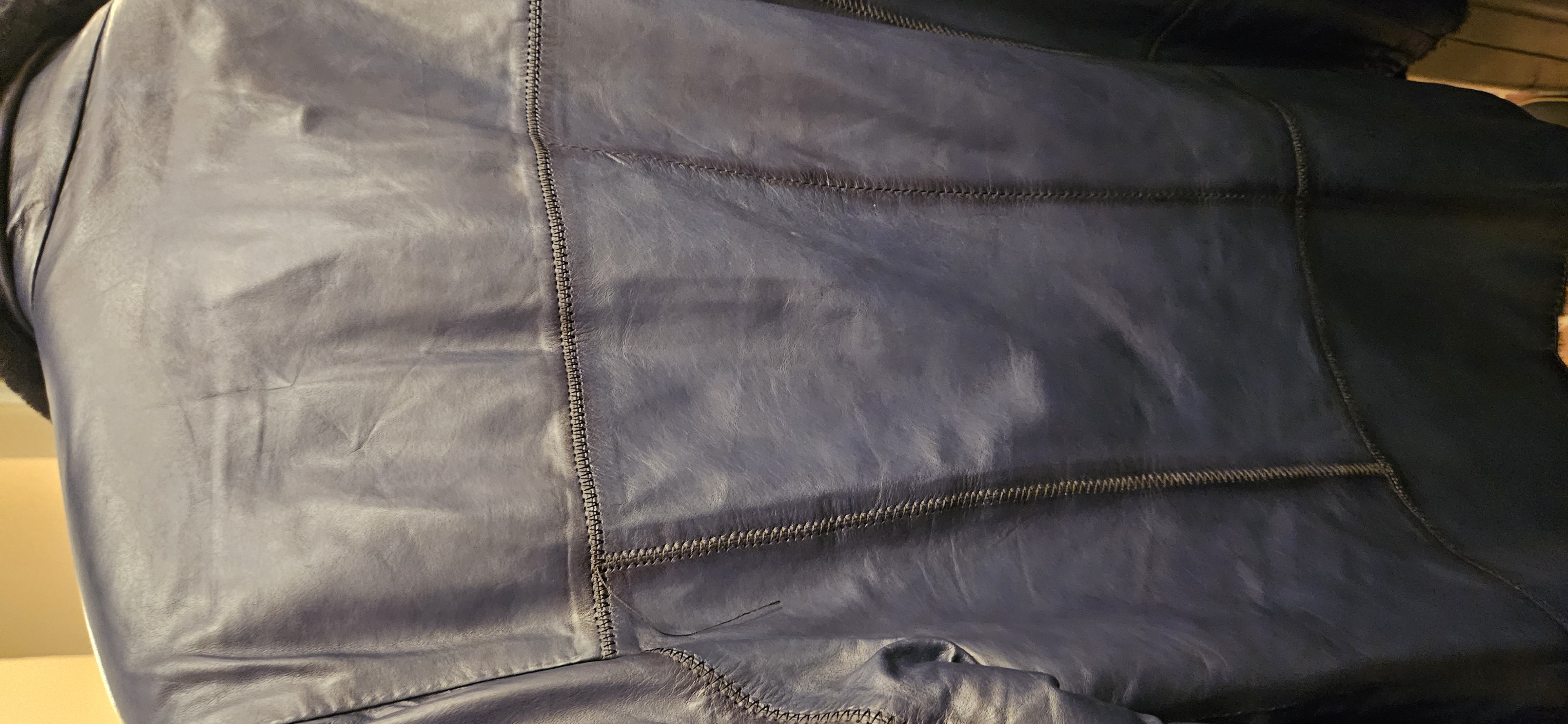 Без бірки, але абсолютно нова. Шикарної якості, натуральна напівматова шкіра з синьо-чорним переливом. Дуже якісний одяг. Купувалася за $500.