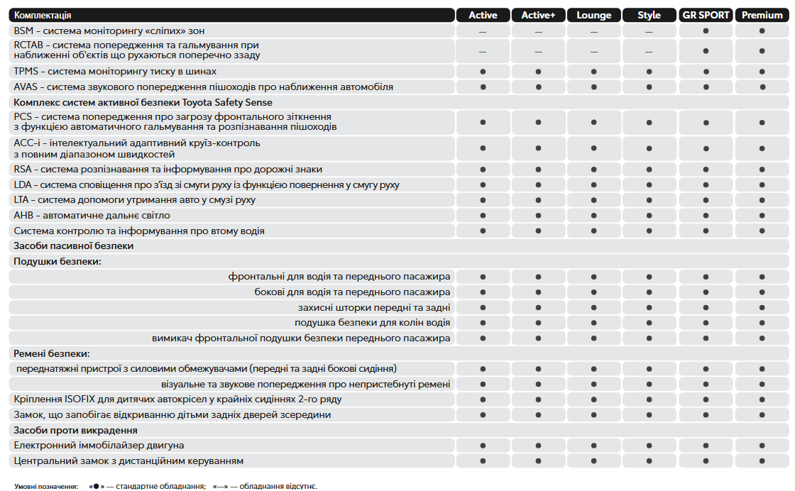 Щодо асистентів, то в лаунджі має бути набір Toyota Safety Sense чи як там воно. Плюс равчика, що навіть у комплектації Актив був уже хороший набір асистентів. Може і не найповніший, але хороший.