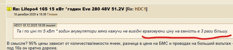 Ви порівнюєте системи з різною напругою. Сенс був порівнювати систему на 48 вольт 15квт/10квт/5квт/2,5квт. А не в кількості комірок. Порівняйте в ємності.