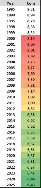 ну тут стало цікаво Все-таки споживання падає. Зробив вибірку по бензинових автомобілях потужністю від 80 до 160 к.с. (є сайти в Європі, де задроти вносять свої заправки). Зліва - рік випуску авто. Справа - сер. споживання. Ясне діло, що похибка якась присутня. Ну і з віком авто не починає споживати менше зазвичай). Але тренд якийсь є. Хоча Іран зараз навчить по справжньому економити, а не оці 2-3 десятих в рік))